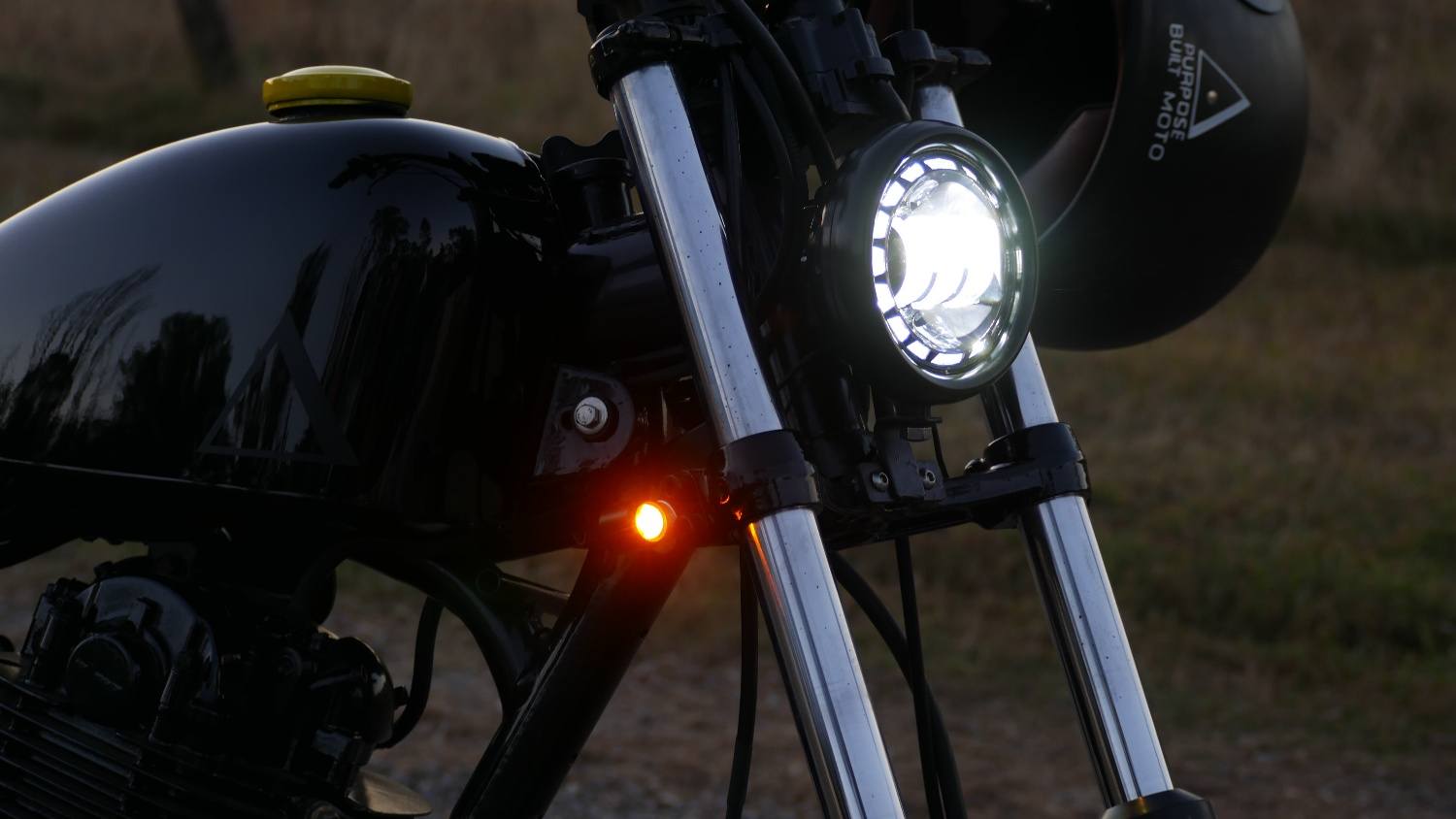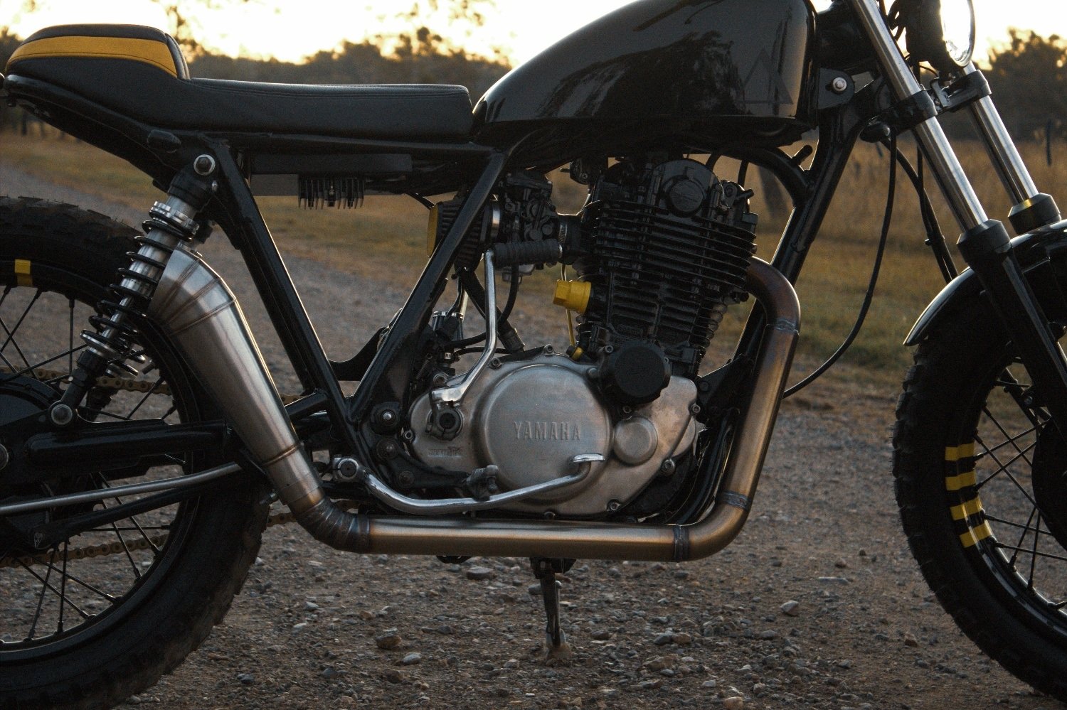 The SR ws stripped to bare bones and the ideas flowed from there. A sportster peanut tank, Scrambler/tracker cross over seat and some off road tyres. Finished with a host of Purpose Built Moto electronics and lighting, and some MX bars and grips.