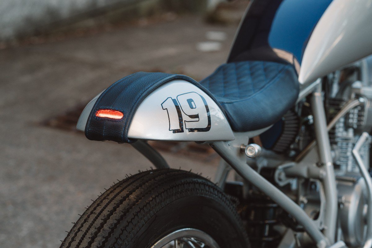 This Cafe Racer received a top to tail Purpose Built Moto treatment, Custom tank, Seat and Tail peice. New Electrics all round, including an integrated tail light/leather tail detail.