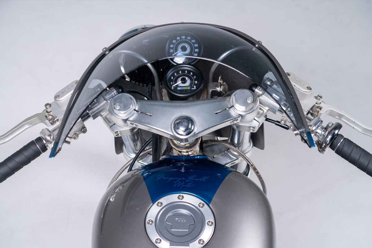 On the inside of the fairing the frame mounts a set of vertically stacked Velona Gauges. The bars wear custom polished hardware including the PBM push button switches, custom press fit bar ends, wrapped leather grips and Domino Classic racer throttle.