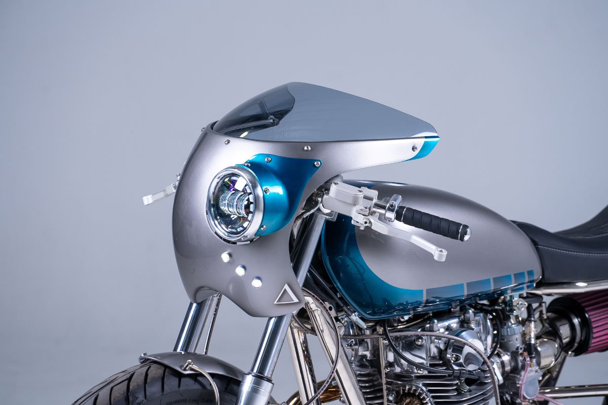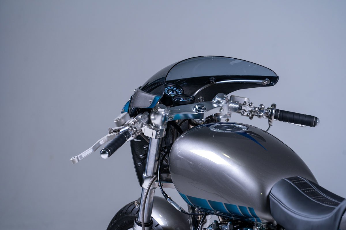 The Traditional Café Racer tail was given a twist, I wanted to avoid making a tail hoop. So the frame was internally braced, and some hidden mounts added to create a light and sharp tail section. The other custom body work is the bikini fairing mounted on the front. Another favourite part of this build.