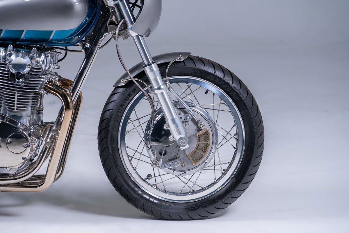The wheels were stripped and rebuilt using a set of 18” Borrani rims. The rear drum hub was retained, the front was swapped with a quad leading shoe 230mm Robinson Drum Brake, linked up to a set of 38mm Ceriani Forks and Custom triple clamps.