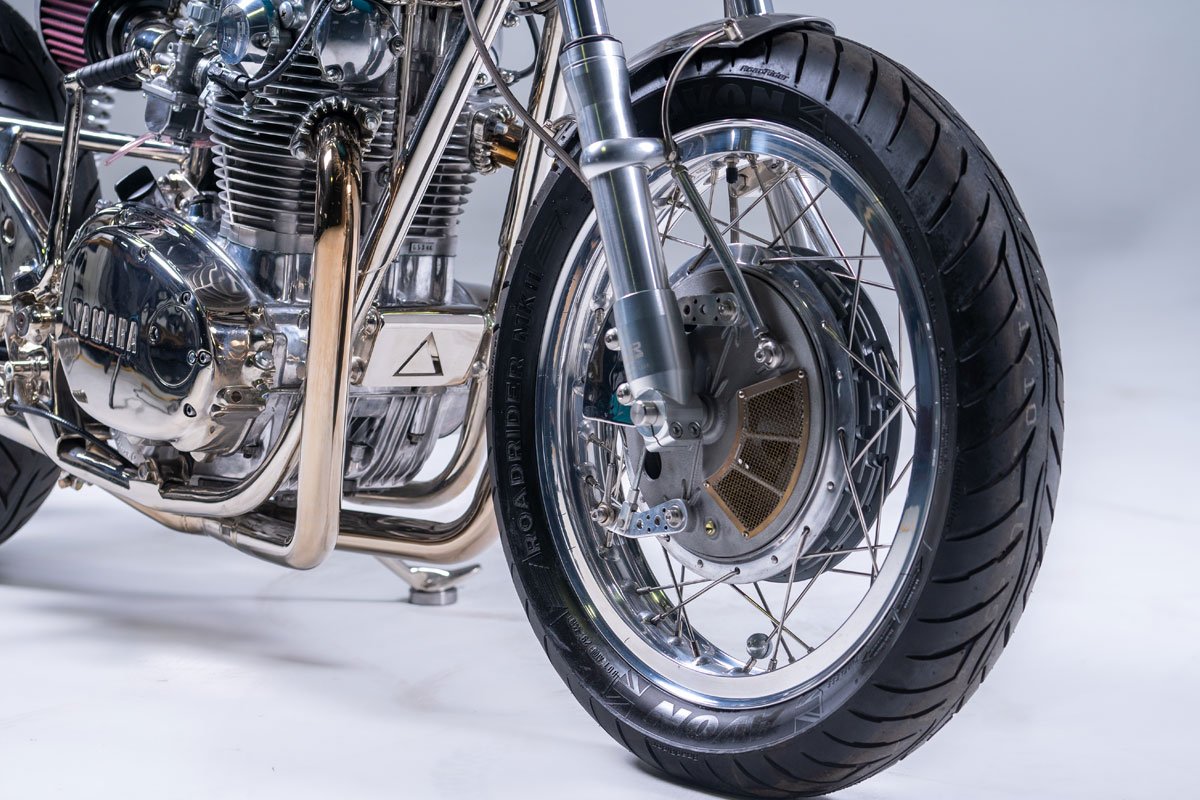 The XS650 Exhaust was kept simple and Symmetrical. The 2 into 1 into 2 system was built in-house from 316 Stainless steel, with an X-pipe under the engine that finished with 2 x PBM torpedo mufflers. All polished to perfection before getting a clean and heat cycle to ensure a nice straw gold colour.