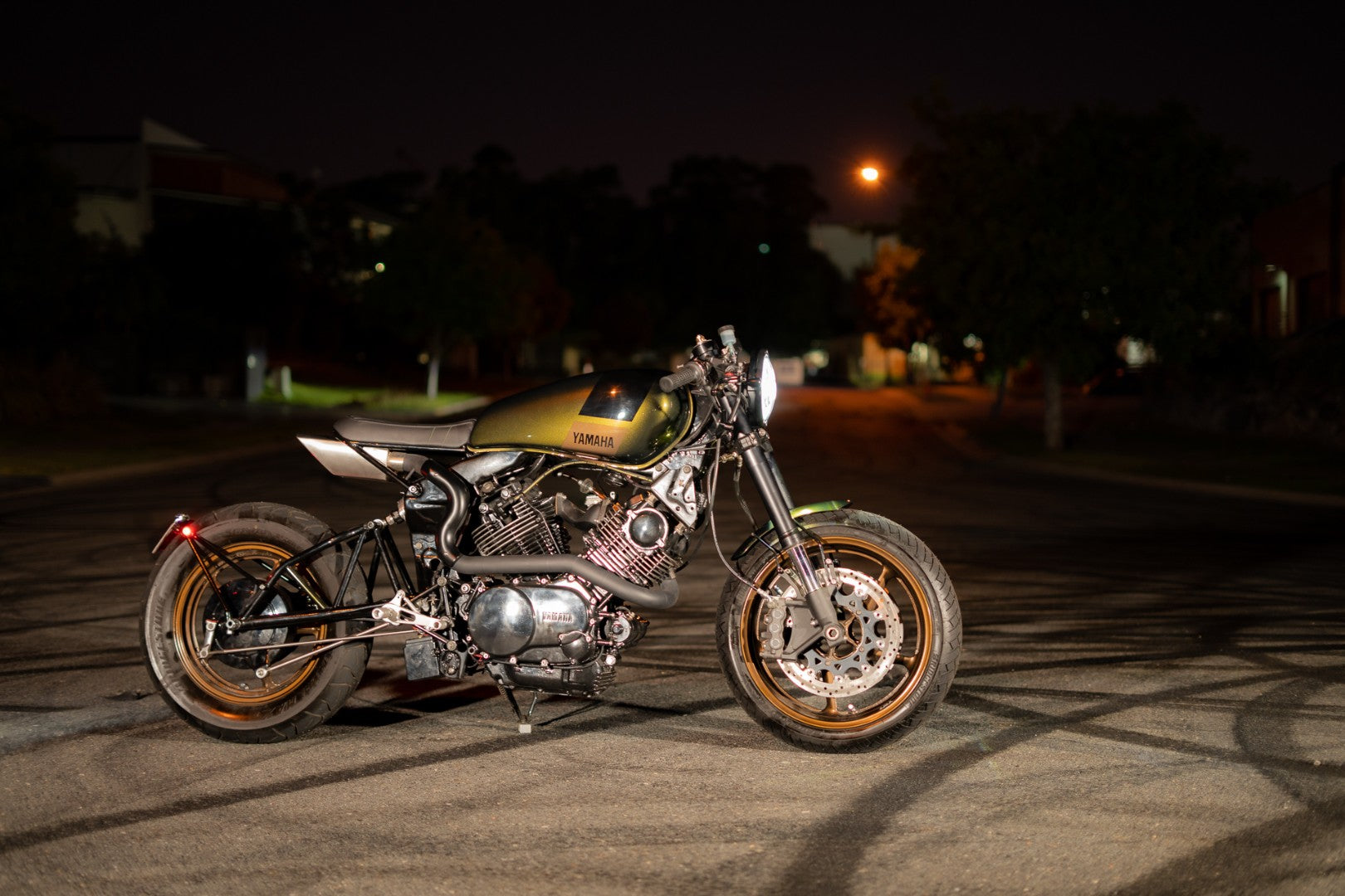 Dyno results showed the rear cylinder has to run quite rich in order to have the front cylinder run at the correct fuel/air ratio. The XV750 isn’t designed to run a single carb, so I’d bet with a twin mikuni set up we could safely milk even more power out of the upgraded engine.When it cam time for styling, the stage was set with fabrication and the bike was sitting in raw metal.The engine, exhaust and moulded frame would be blacked out. The hard part was choosing the colour for the tins. We’d received the wheels already powdercoated in a really nice bronze colour so we needed to find something that matched. The rider and myself went back and forth on a few colours, red, black, and eventually settled on a metallic olive green that caught his eye.Justing from Popbang classics laid this colour down with a simple blocked detail design over the tank and hand built front fender. A stellar job as always from justin that allowed assembly to start.
