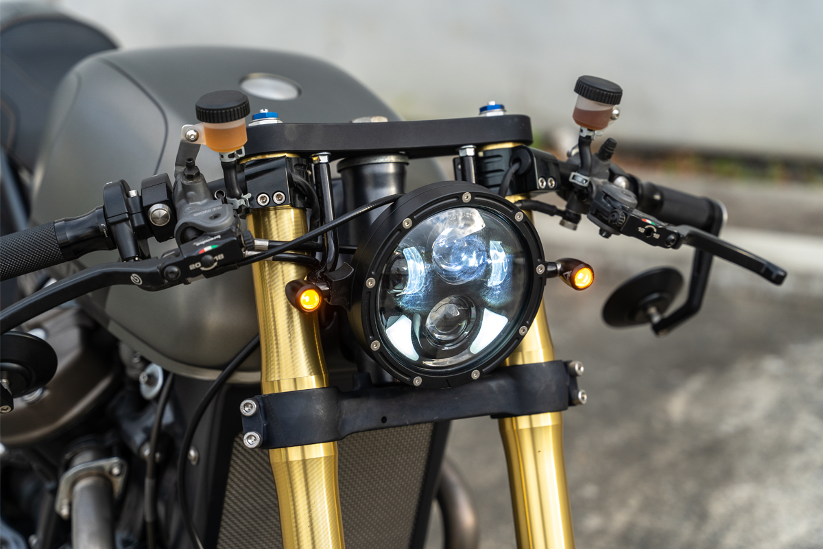 The lighting was sorted out front to back with our LED headlight and 3 in 1 LED blinkers, all mounted on custom fabricated brackets.