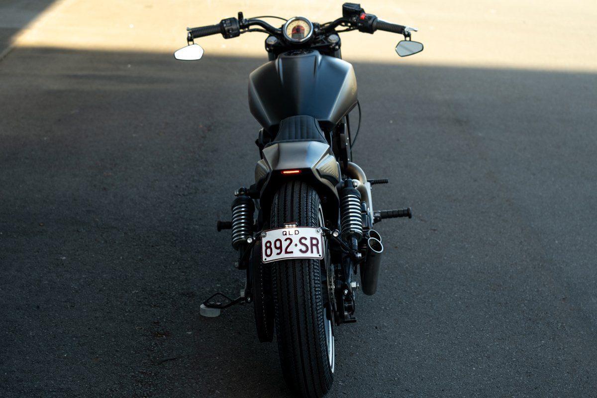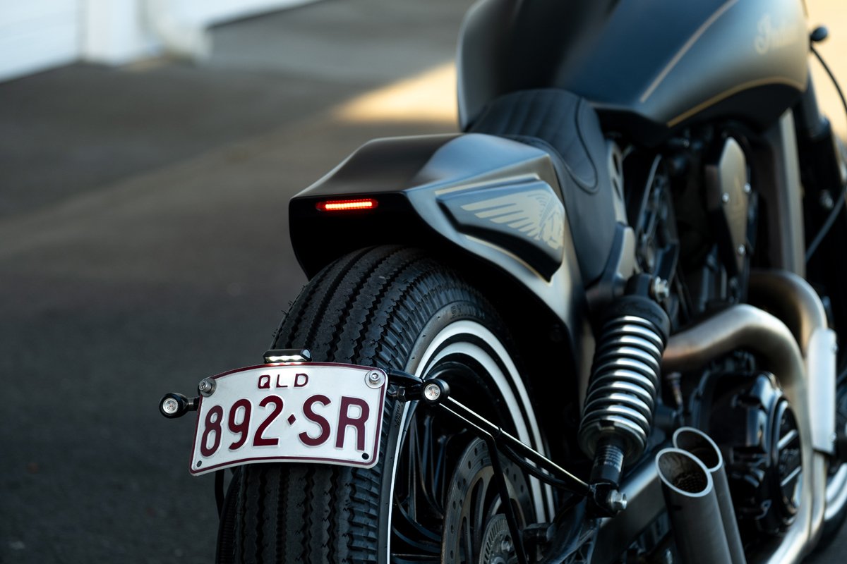To complete the tail a new wrap around plate mount was built, and an LED brake light fabricated into the tail housing. Showing off our 3 in 1 Hollow Tip Turn Signals on the rear. Run by a Badlands brake module that is needed when fitting aftermarket lights to these bikes.