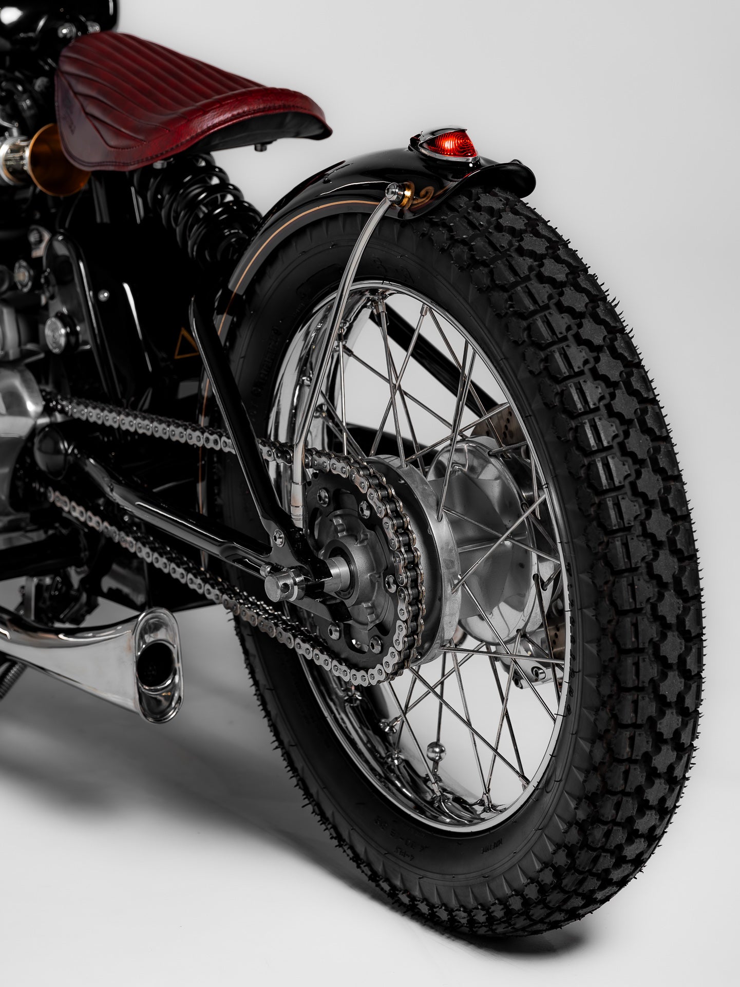 Tank and Bodywork: We shaped the aluminum fuel tank in-house for a slimmer profile that accentuates the engine. The seat is a floating bobber-style design, trimmed in leather that’s reminiscent of old-school craftsmanship. Fender work, custom brackets, and smaller details like the art-deco-style rear light round out the purposeful vibe we were after.