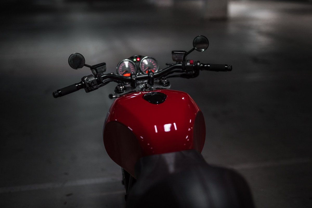 The use of the Slim Purpose Built Moto LED headlight allowed for the stock gauges to be lowered 25mm, this is always a point of friction for most GT1000 owners, where due to the electronics system the bulky factory gauges are difficult to swap out. This solution however draws the eye away from the large gauges by tucking them down a little further and having them sit more in line with the bikes natural curve over the tank.
