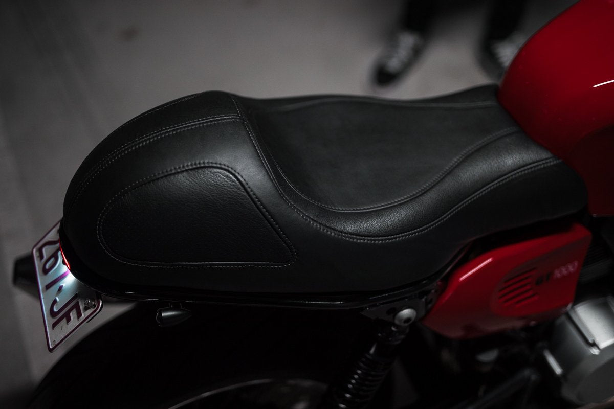 It started with a seat. We offer an “off the shelf hand made seat for the Ducati Sport classic. The owner found PBM through that and as they often do, the job turned from a simple seat upgrade into a top to tail facelift on this Italian Beauty. I set the seat out and drafted a design, then our in house Upholsterer Jamason –Timeless Autotrim waved his magic needle at it and turned out a Black leather masterpiece, accented with perforated leather. To completely tidy the tail, an LED strip brake light was recessed into the GT1000 frame, The rear also received a hand made tail tidy, and a set of Hollowtip LED indicators.