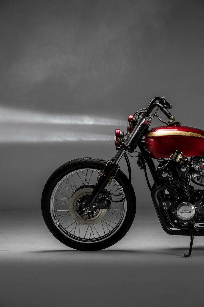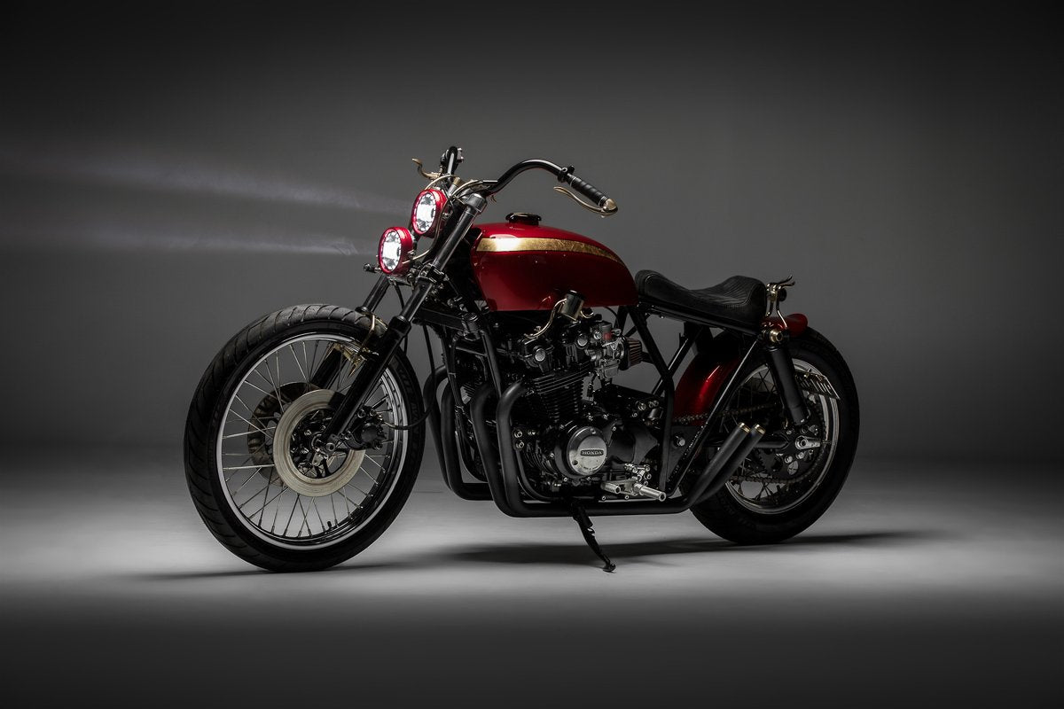The CB900 engine was cleaned and dressed up with a coat of black paint, some mildly polished cases will also be left to patina over time with the brass accents. The engine also received a set of Keihin CR carburetors and DNA performance filters. It really opens up the power curve of the 900 four and delivers a far more intense ride experience.
