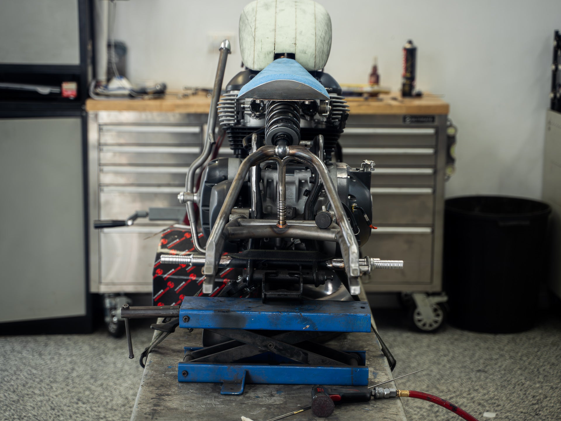 Fitting the front shock setup was high on the priority list. We opted for a modern air shock that allows more adjustability than a traditional coil or leaf spring. This choice keeps the vintage look intact but gives us the ability to dial in the damping for a smoother, more controlled ride. When it all came together, we could finally stand back and see that unmistakable girder silhouette—raw, mechanical, and built for the long haul.