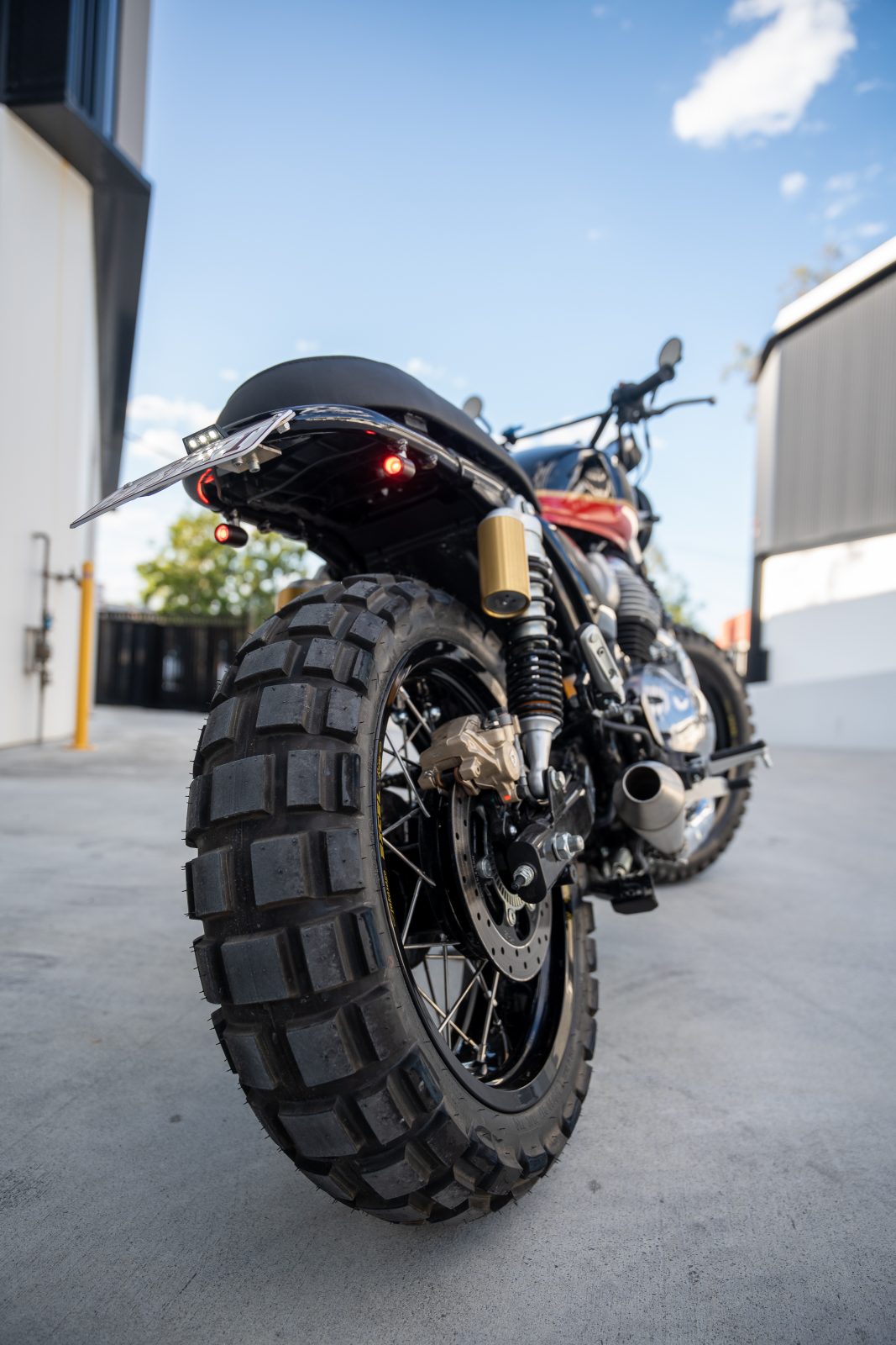 With the removal of the GT650’s rear fender, we’ve fit up a PBM Tail Tidy Kit and then used a set of our Dome 3-in-1’s to act as the tail brake light and indicators. These were tucked up on a factory frame mount. Removing the large fenders reveals a better view of huge wheels and tyres jammed into the GT650’s frame. The decision was made not to cut the frame to shorten it, purely in the interest of keeping the job simple and allowing our rider the option of replacing the factory guard.