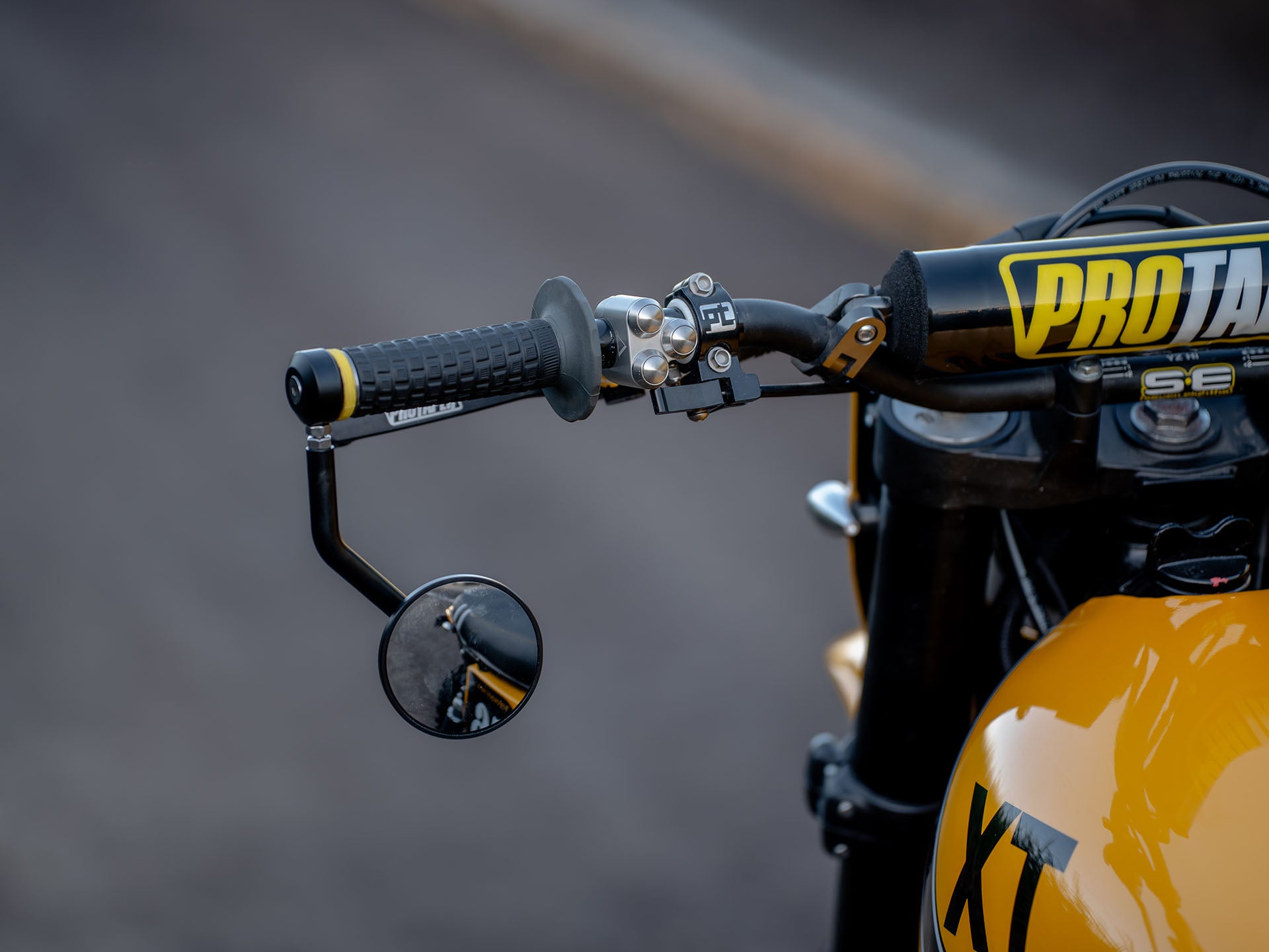 Mirrors are a small but impactful part of your bar setup (and often necessary). You can mount them on the ends of your handlebars (bar-end mirrors) for a clean, minimal look, or closer to the center of the bars if you prefer a more traditional setup. Check out Purpose Built Moto’s Scrambler Mirrors and Bar End Mounting Kit for good options here.