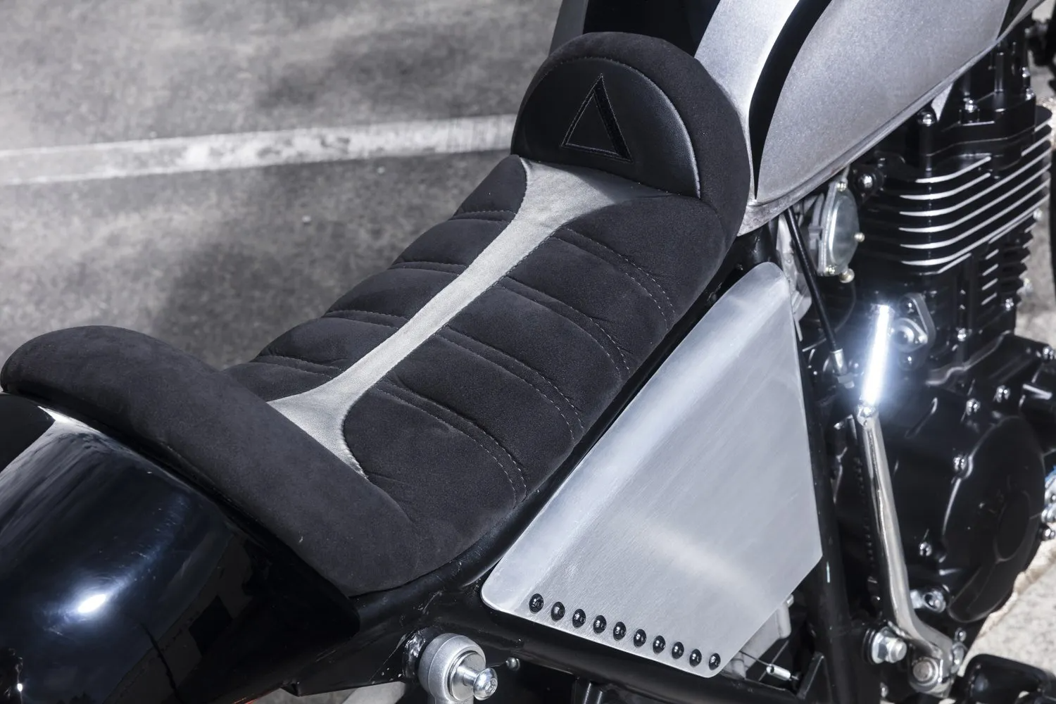 The seat was foamed and shaped and I sat down with my ever creative upholstery guru Jameson to nut out a design. As long as I have a picture in my head, he can put his spin on it and make it happen! We settled on a super plush Black Alcantara design complimented with some low sheen black leather. Sitting proud is the embroidered PBM Delta. Purpose Built Moto is now offering custom upholstery work and leather in house, on any seat, not just the bikes we build!
