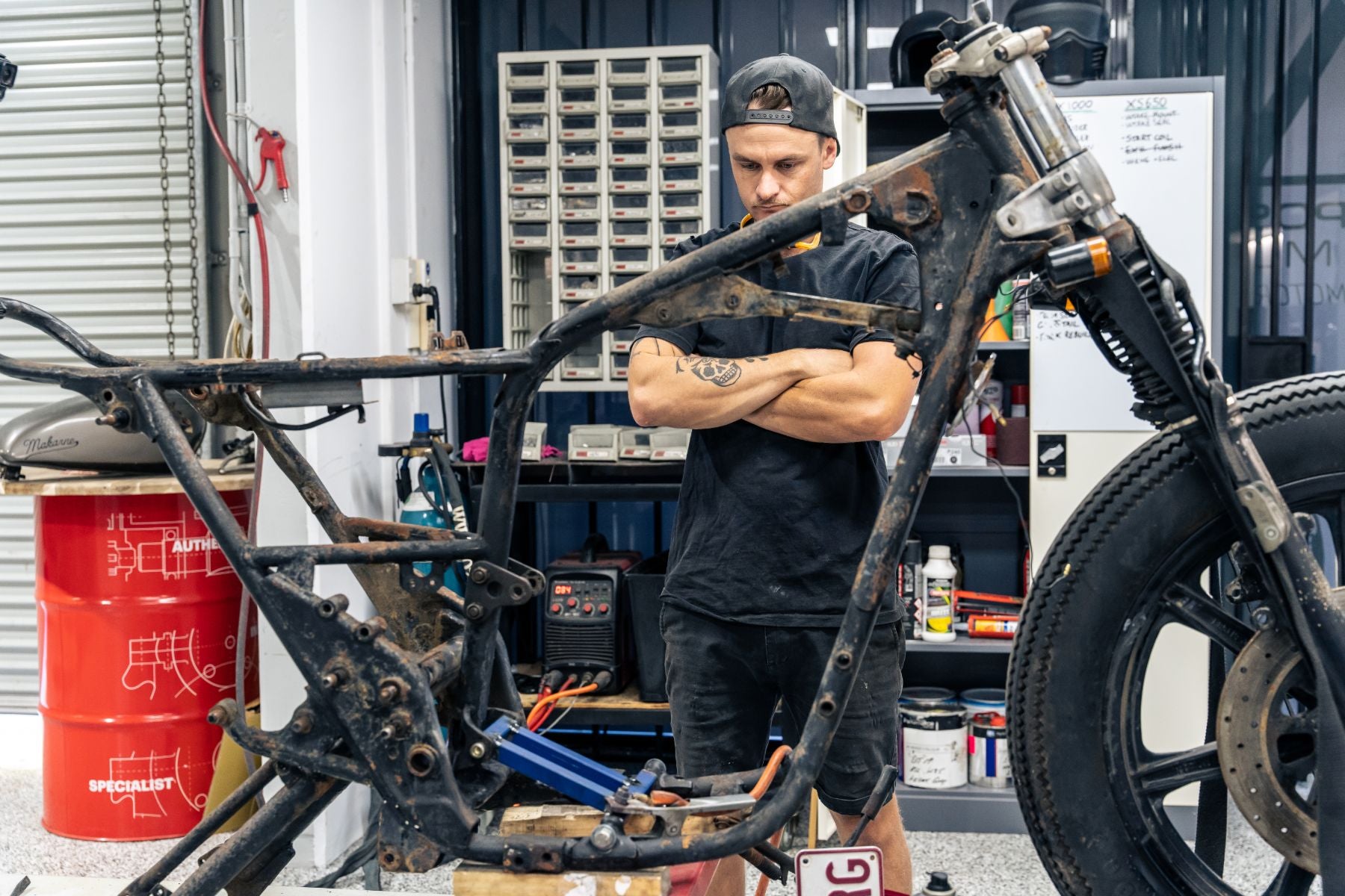 First job is to get the wheels off and measured so we can get a set of Jonich specialty wheels on the way from Italy. A bit of fine measurement here to make sure we get a perfect fit. The chopper will be running a 21” front wheel and a 19” rear. To make sure we can fabricate the bike without the correct wheels, I make sure to write down my tyre diameters and set that up on the bench properly as we fabricate.
