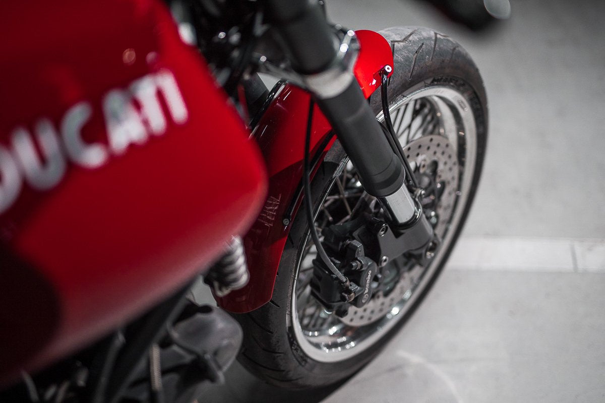 It’s worth mentioning here that on the fork you need to link 2 mounting points together on each side to create rigidity and not have the mount’s pivot on a single point. Having that happen could be disastrous. So make sure the mounts can pivot and move during your design stage. Different bikes have different mount points so use your imagination and anything can be made to look like it belongs there. The fender mount shown here is a Ducati GT1000 we gave a facelift. Doing away with the plastic fender and mount to make way for a custom aluminium café racer fender and hand-built mounts. Finished in black and red to keep em classy!