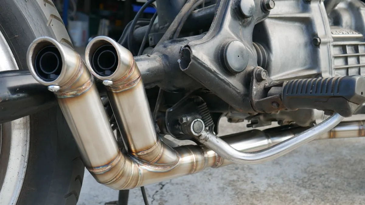 Motorcycle looking at a slip on muffler.