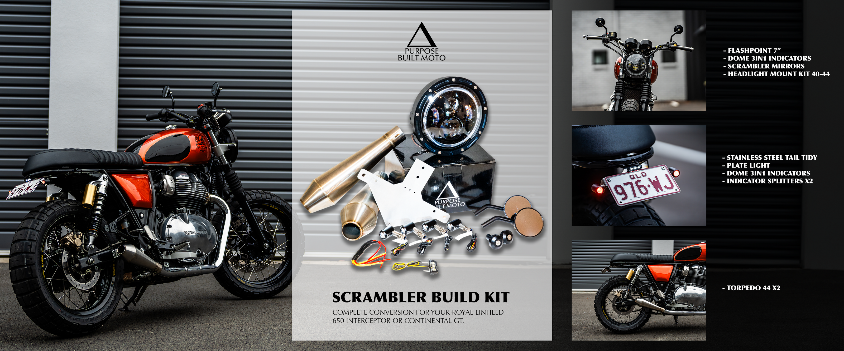 Inspired by our own scrambler project, this kit includes everything needed to bring a touch of Purpose Built Moto’s style into your garage. Here's a look at what the kit includes: