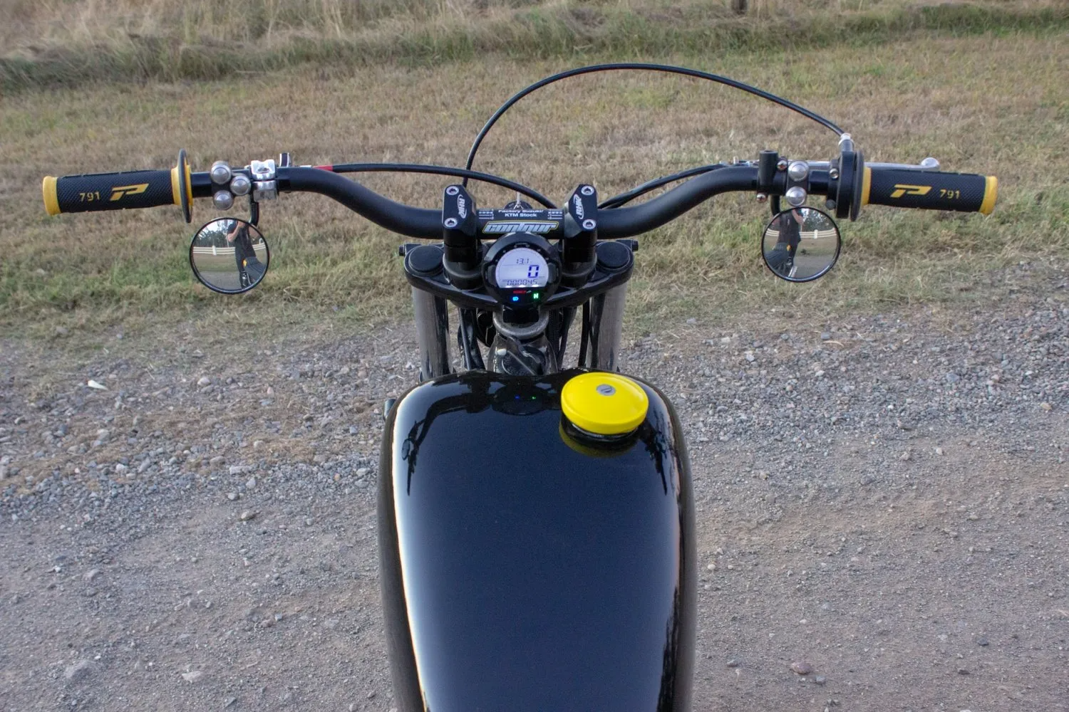 Any off the shelf components don’t fit right, off road style mirrors are horrible fold away plastic garbage and the universal bar ends don’t suit either. Bar end mirrors look at home on a more street suited bike, but the idea of having mirrors hanging off the end of your bars for passing branches to pic up, never really felt right.
