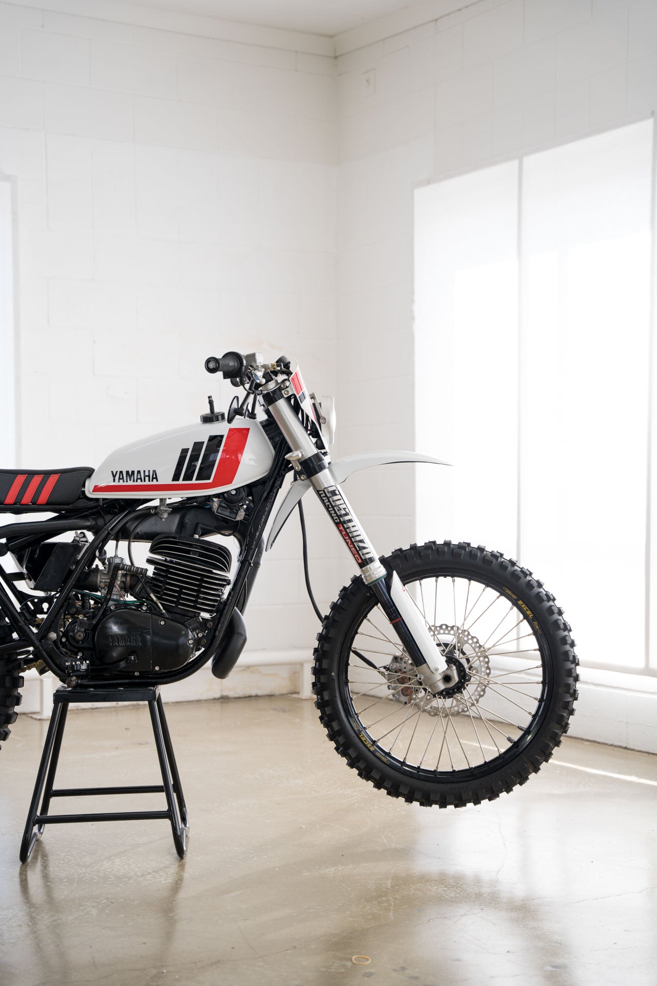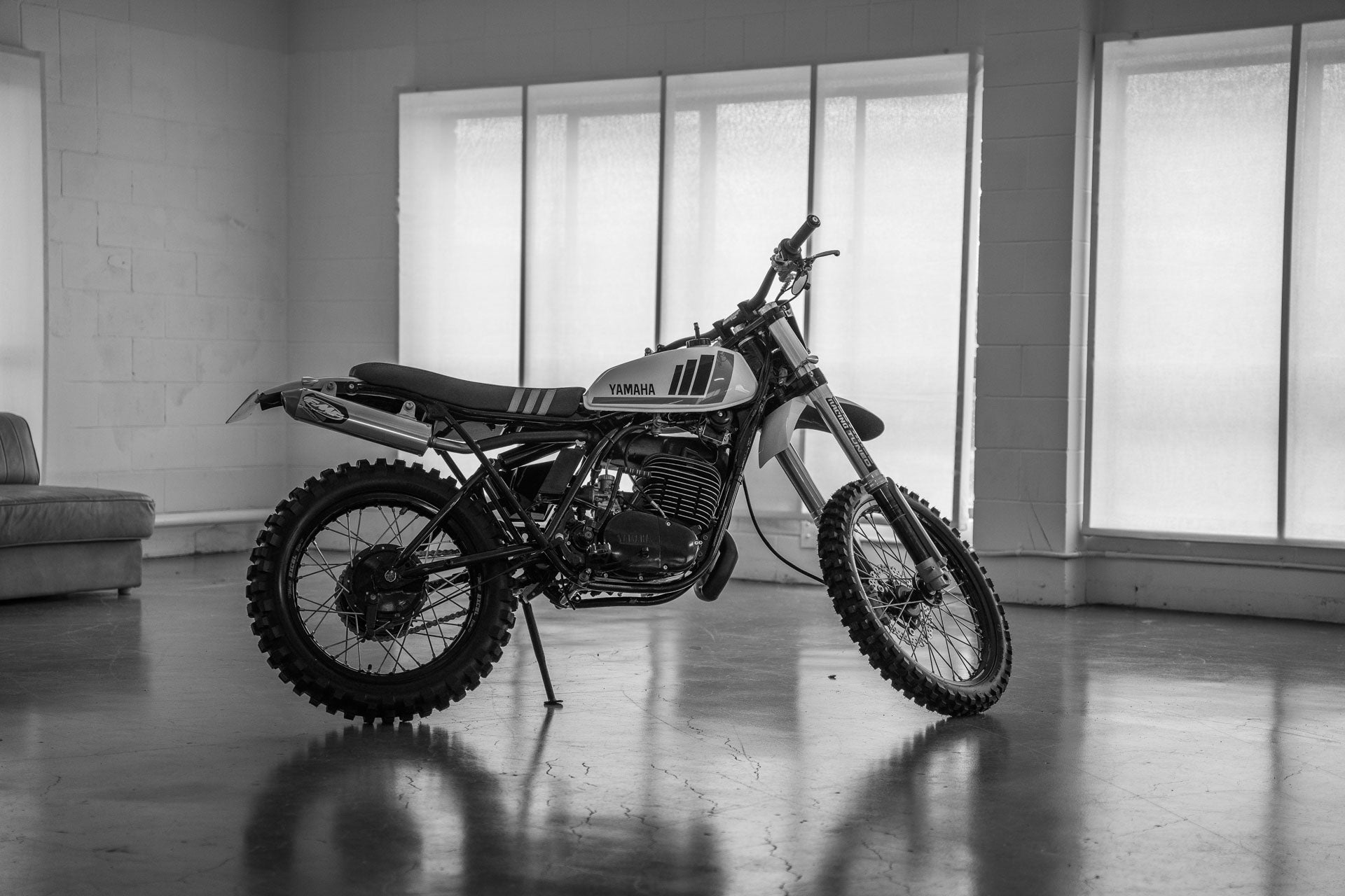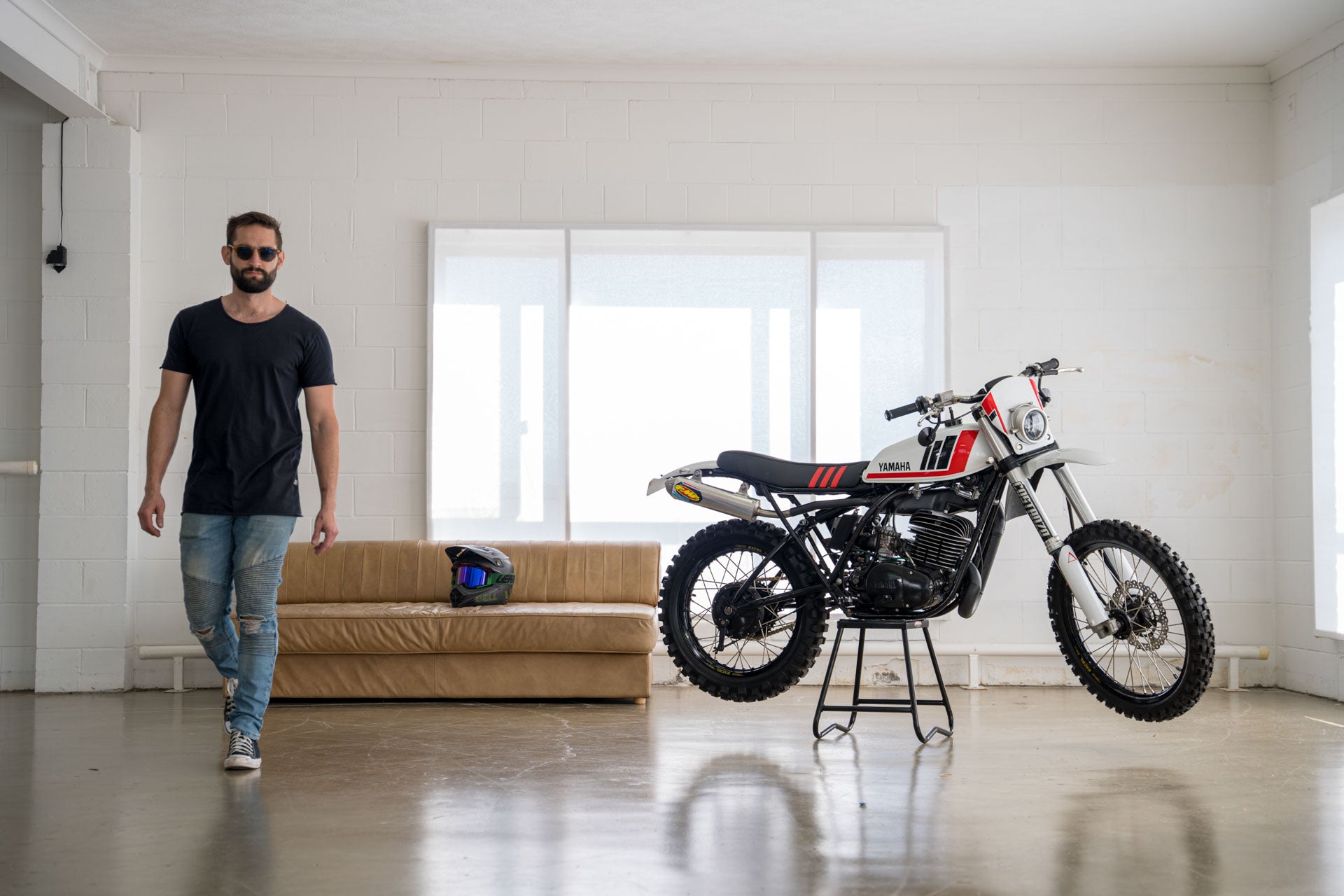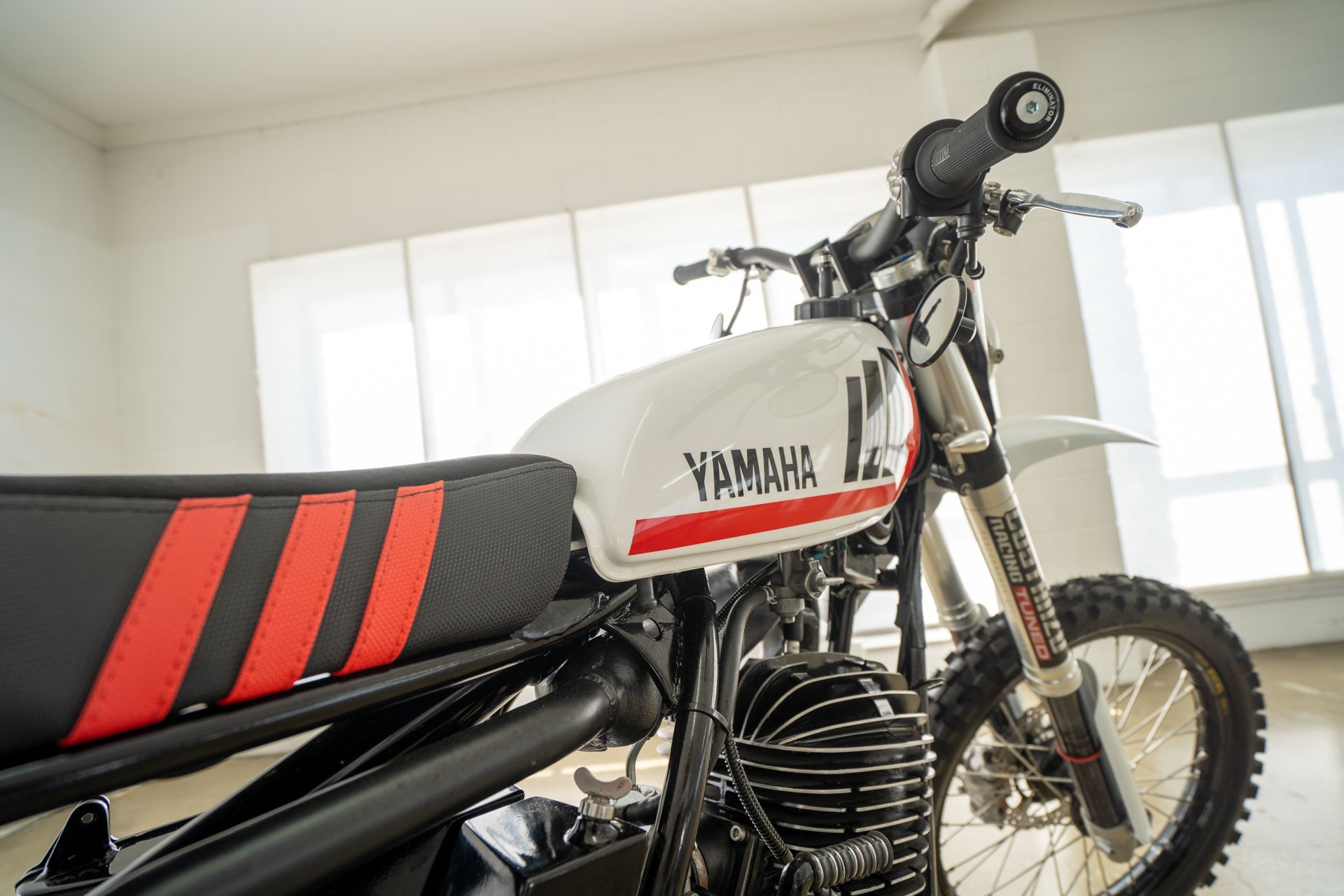 Ich selbst besitze eine DT400 Scrambler von 1975, es ist ein tolles Fahrrad. Im Originalzustand handelt es sich um ein übermotorisiertes Farmbike, um ein Oldtimer-Enduro-Rennrad, das Sie registrieren können, und um dieses Bike, als Sie mit 10 Jahren von Ihrem betrunkenen Onkel beim Familiengrillen ausprobiert wurden, hat es Ihnen eine Heidenangst eingejagt. Aber wenn man sie bis auf die Knochen zerlegt und das Chassis von seiner müden und schlaffen Federung befreit. Die DT400 sehen eher aus wie ein Fahrrad, das man auf eine MX-Strecke richten könnte. Das war es, was unser Fahrer Clint wollte.
