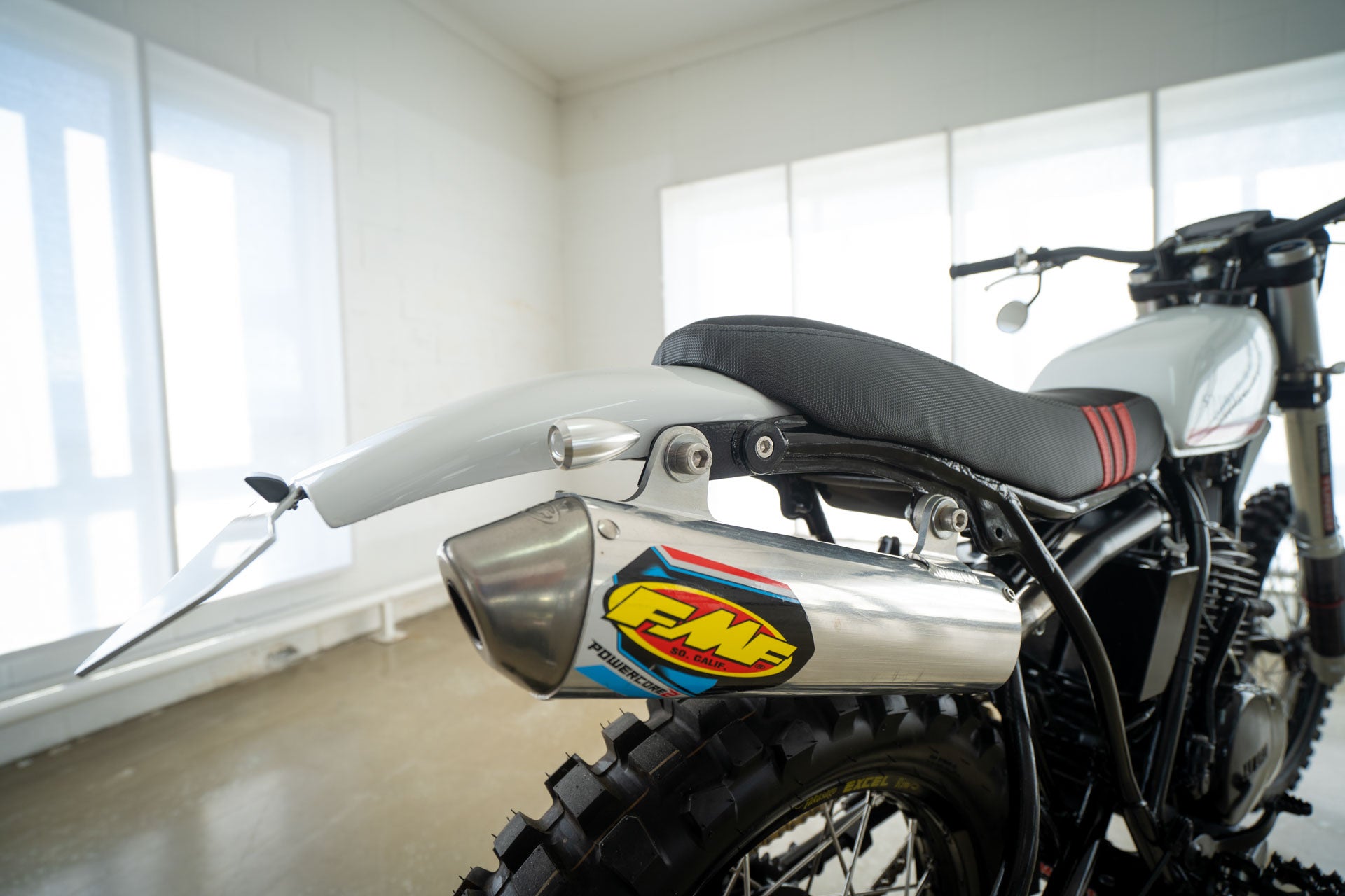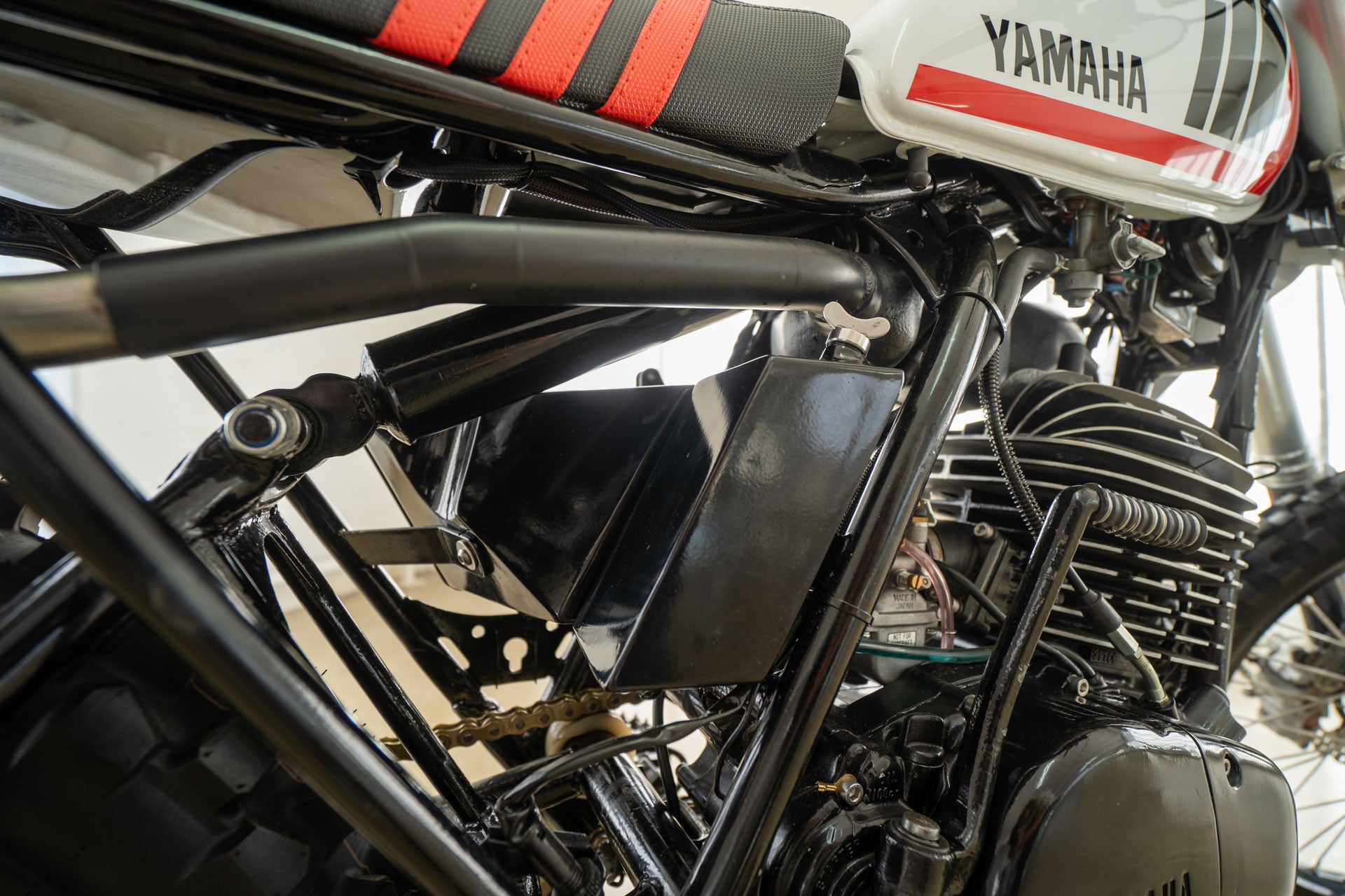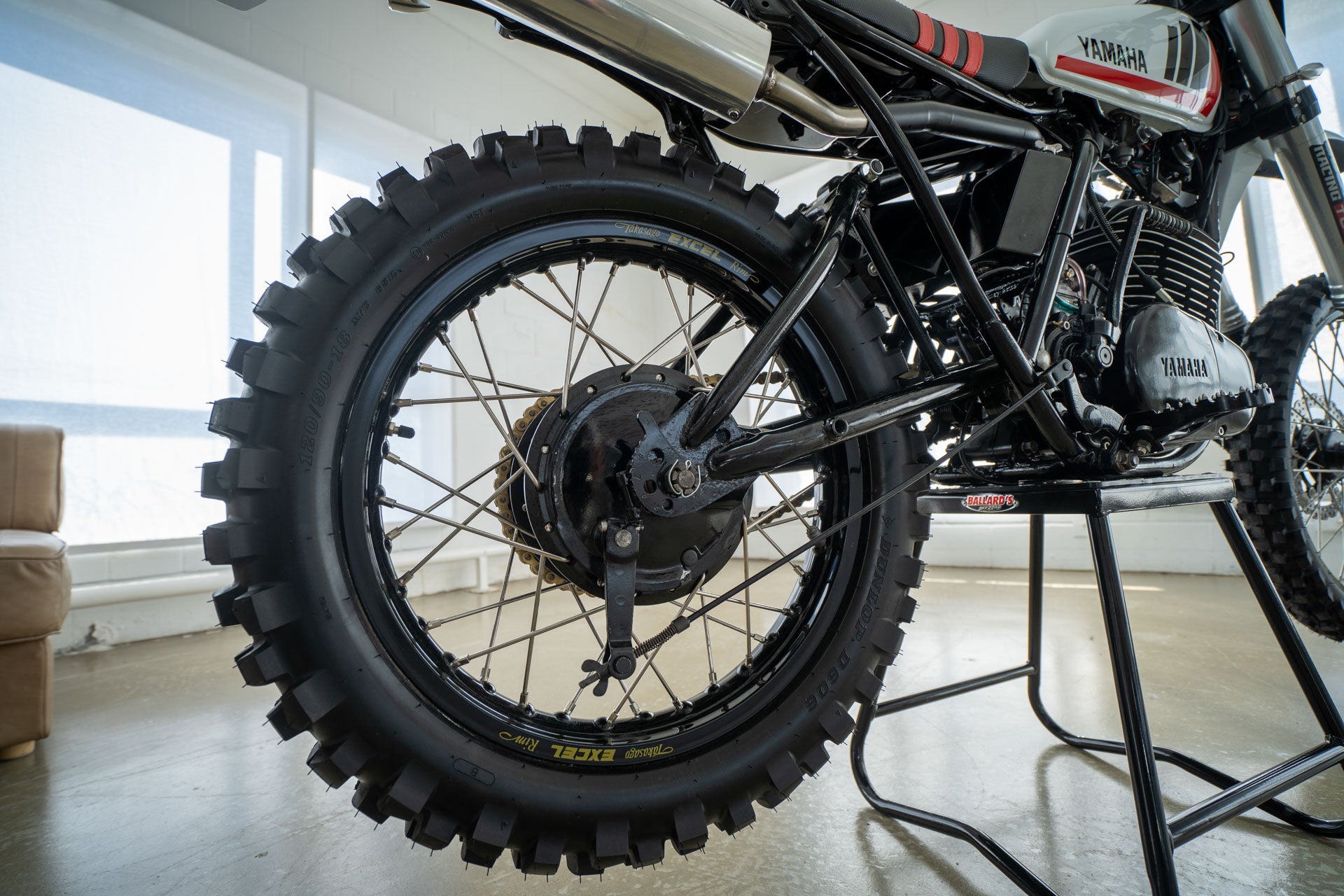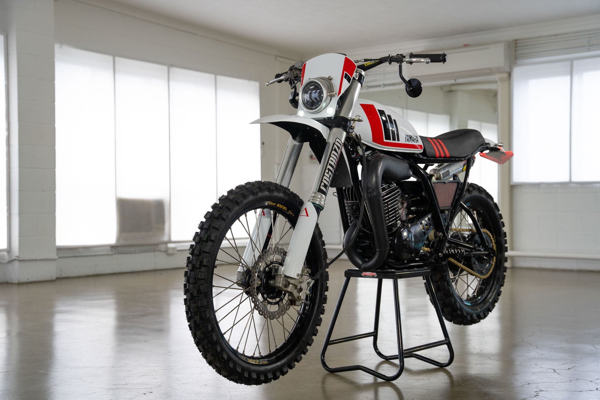 Ich selbst besitze eine DT400 Scrambler von 1975, es ist ein tolles Fahrrad. Im Originalzustand handelt es sich um ein übermotorisiertes Farmbike, um ein Oldtimer-Enduro-Rennrad, das Sie registrieren können, und um dieses Bike, als Sie mit 10 Jahren von Ihrem betrunkenen Onkel beim Familiengrillen ausprobiert wurden, hat es Ihnen eine Heidenangst eingejagt. Aber wenn man sie bis auf die Knochen zerlegt und das Chassis von seiner müden und schlaffen Federung befreit. Die DT400 sehen eher aus wie ein Fahrrad, das man auf eine MX-Strecke richten könnte. Das war es, was unser Fahrer Clint wollte.