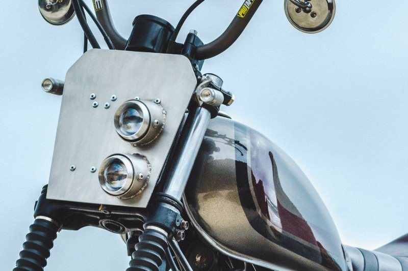 Dieser Aufbau verfügt über eine ganze Reihe speziell angefertigter Moto-Prototypenteile, darunter den High-Ball-Schalldämpfer, einige Seitenabdeckungen und Kotflügel aus Edelstahlgeflecht sowie eine speziell angefertigte LED-Lichtplatte aus gebürstetem Edelstahl. Wir haben es außerdem mit unseren aufgeräumten LED-Blinkern und Lenkerschaltern abgerundet.