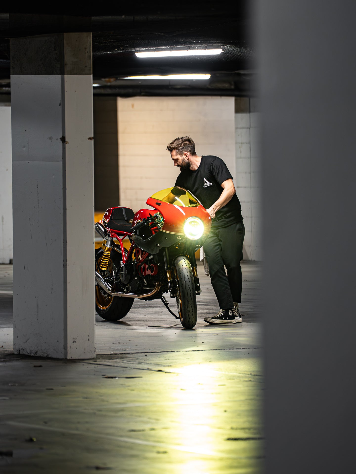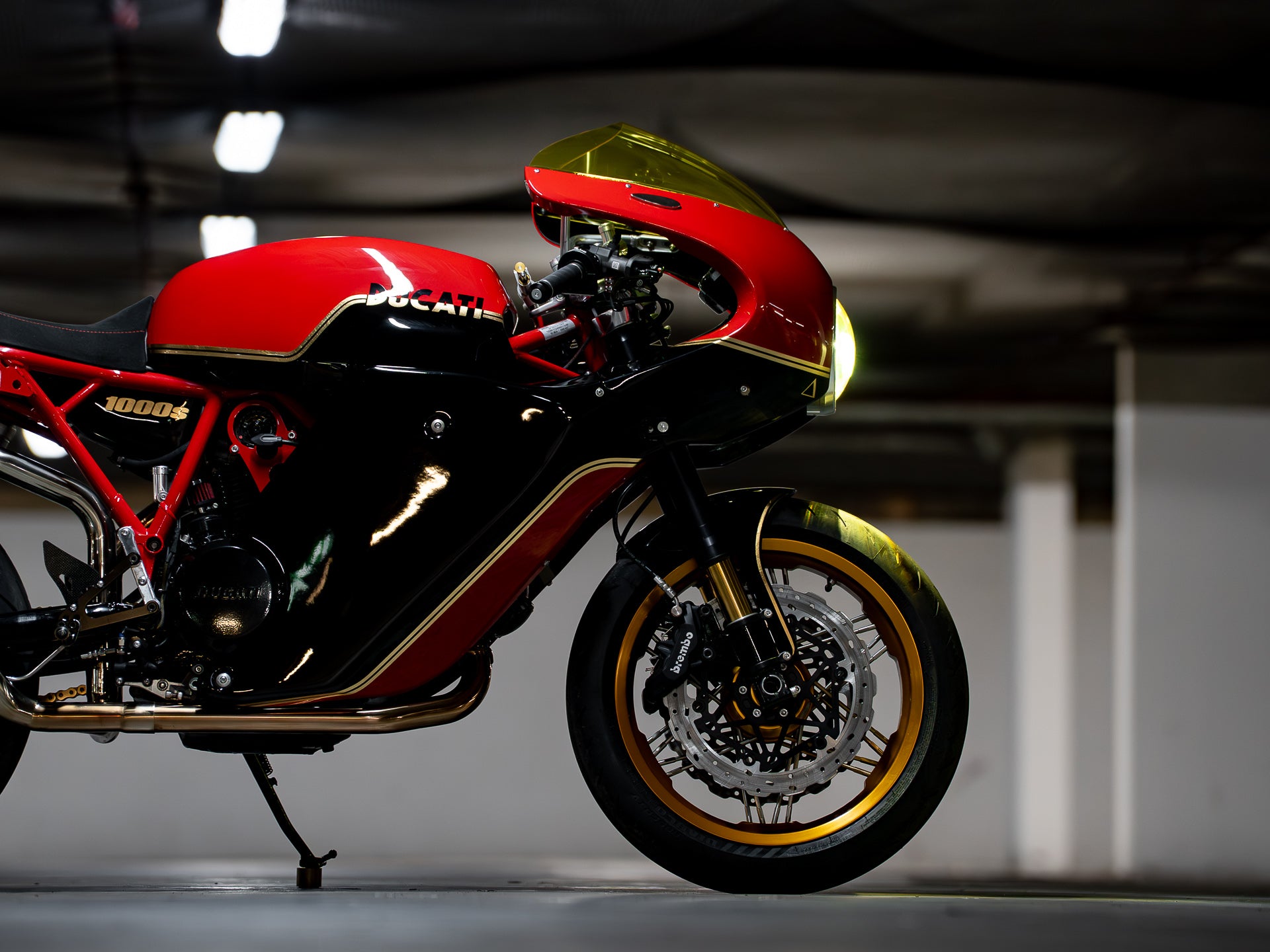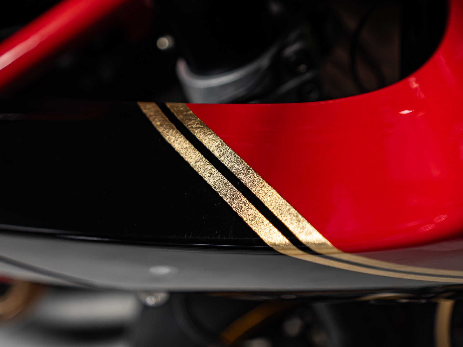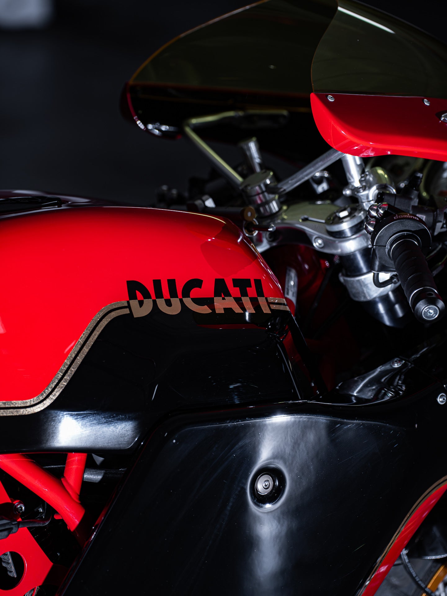 I laid out a two-tone design using Ducati red, gloss black, and accenting it with gold leaf pinstriping. This would create an unmissable paint combination that lets the form of the motorcycle speak for itself and compliments the wheel styling of the build. With Jeff’s approval, we pressed forward and sent it to Justin at Popbang Classics, who laid it down perfectly.
