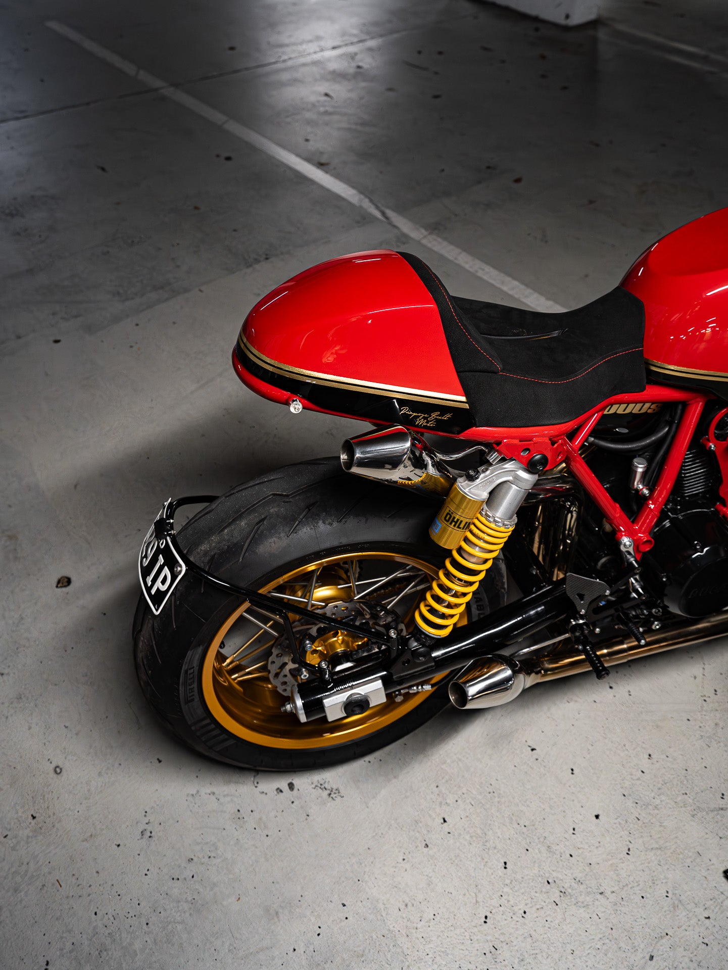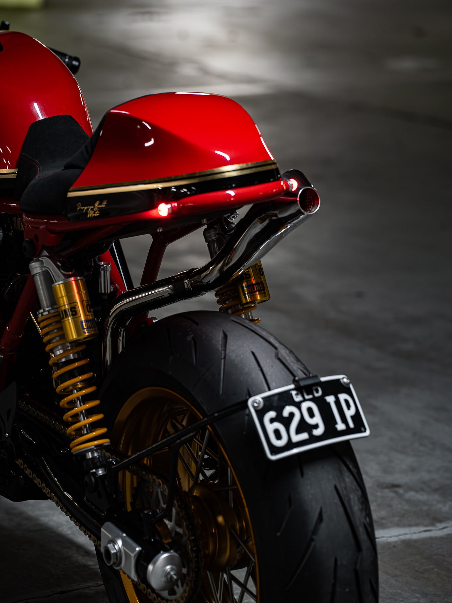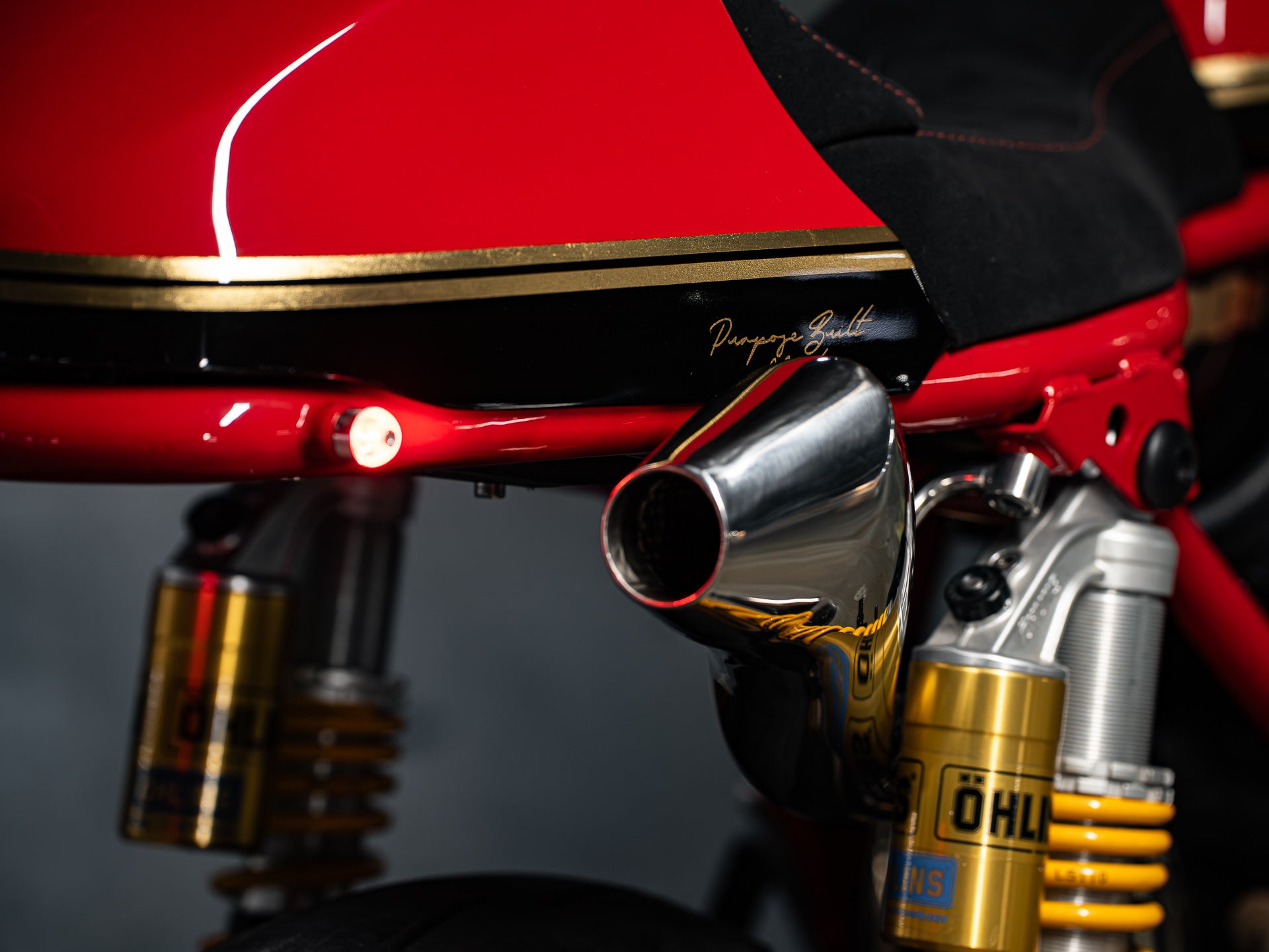 With the bike completed in terms of custom fabrication, I called Joe from Ride Dynamics to take the suspension in for a rebuild. The forks were fitted with Ohlins cartridges, re-coated with gold nitride, and black anodised on the fork tubes. The rear was upgraded to a fully adjustable Ohlins TTX shock set.