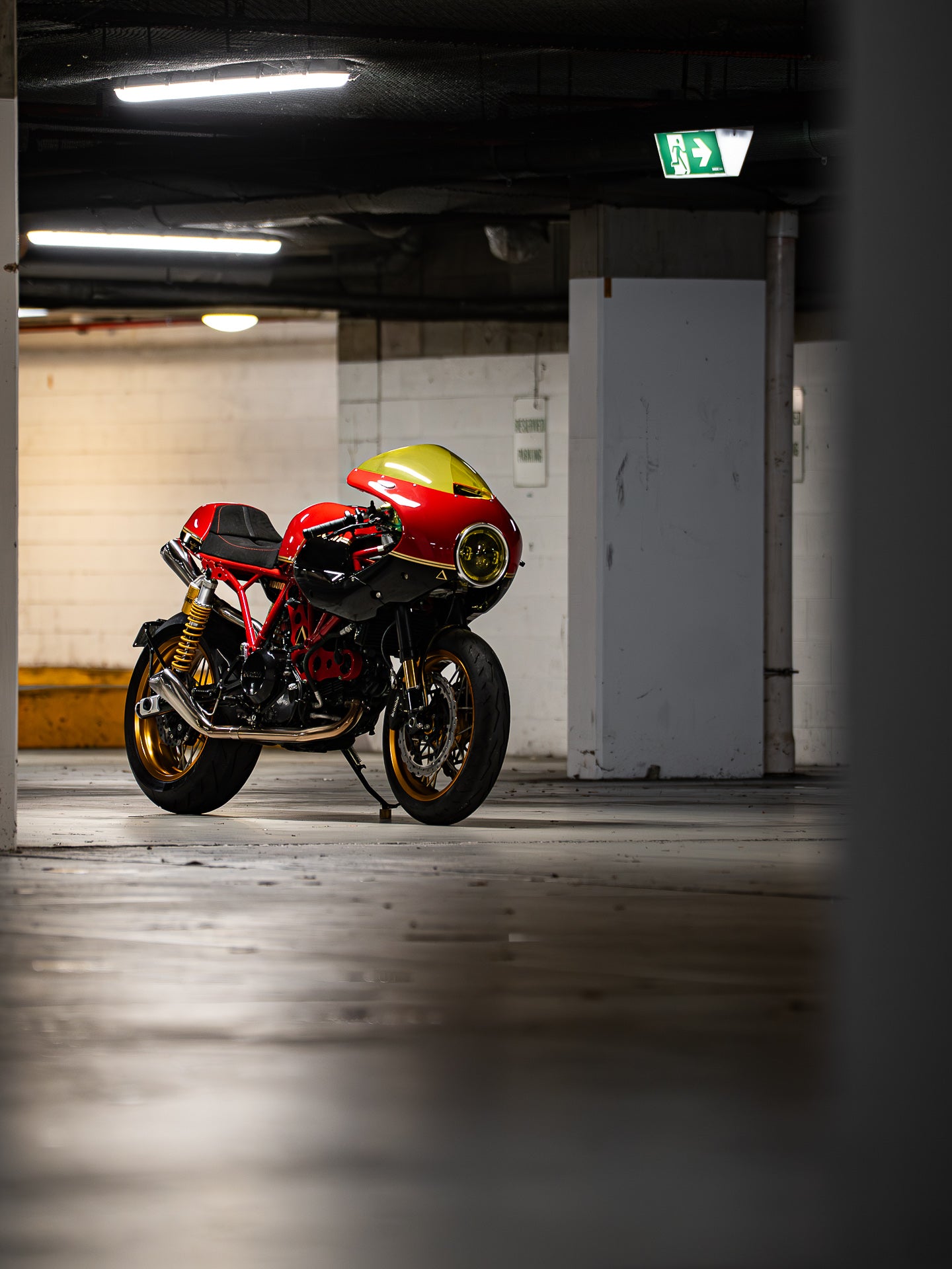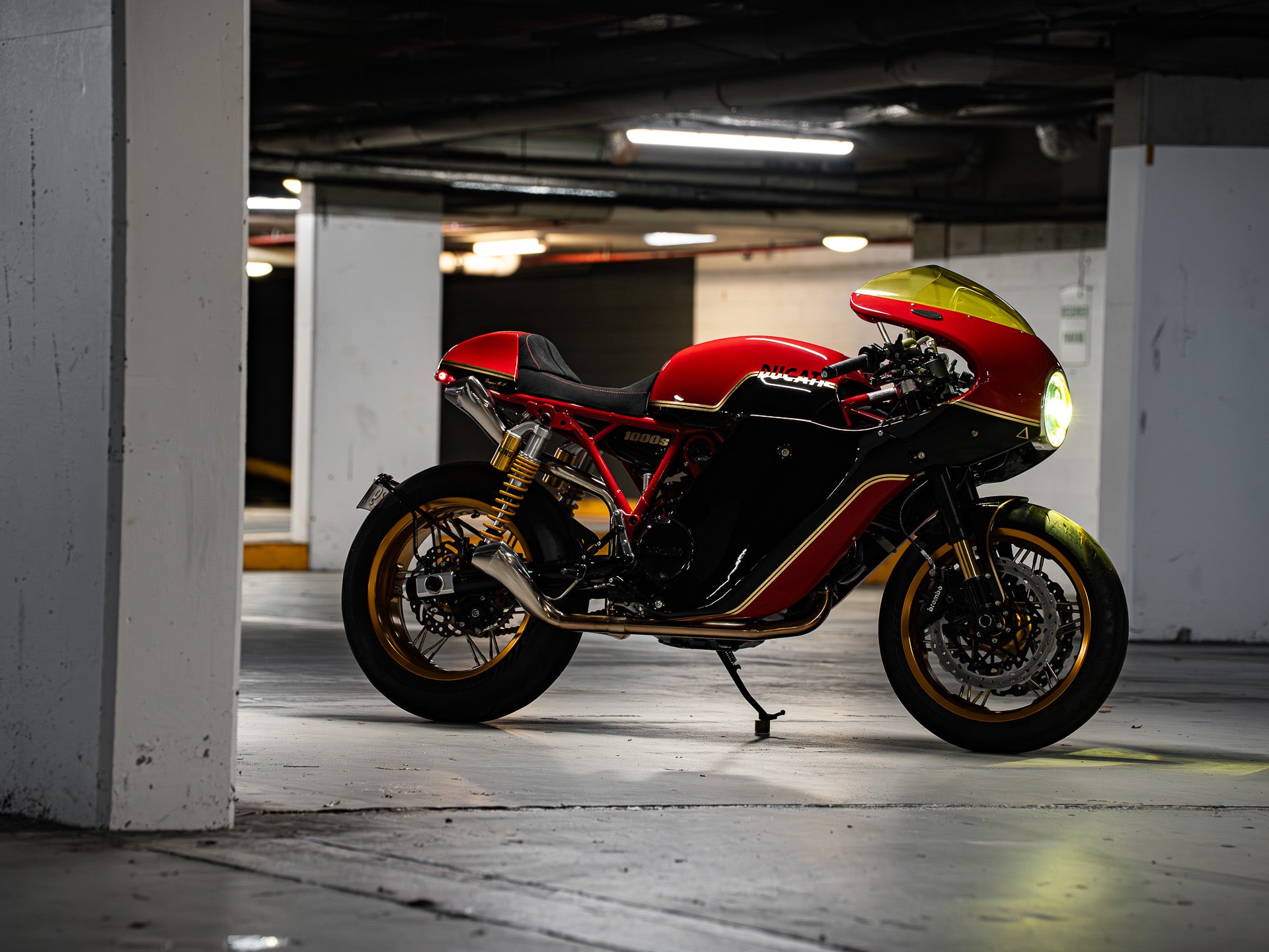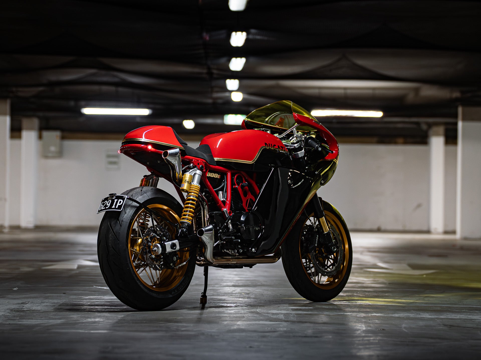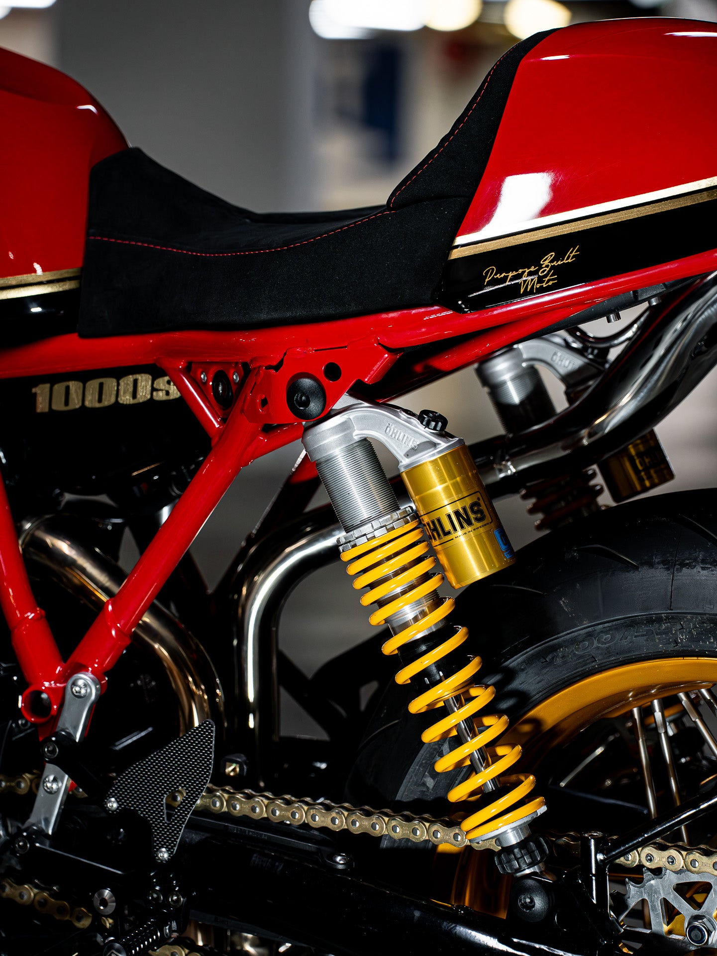 With the bike completed in terms of custom fabrication, I called Joe from Ride Dynamics to take the suspension in for a rebuild. The forks were fitted with Ohlins cartridges, re-coated with gold nitride, and black anodised on the fork tubes. The rear was upgraded to a fully adjustable Ohlins TTX shock set.