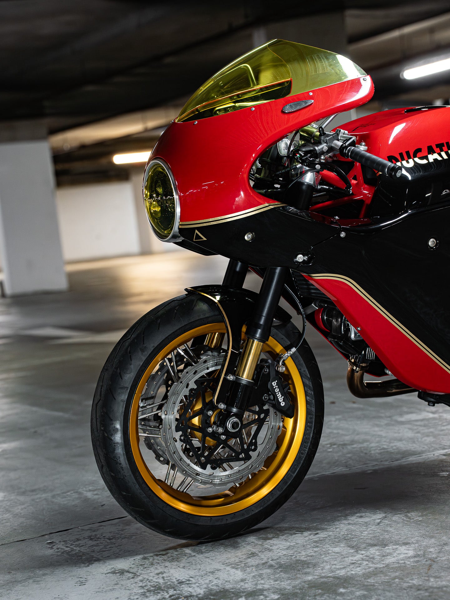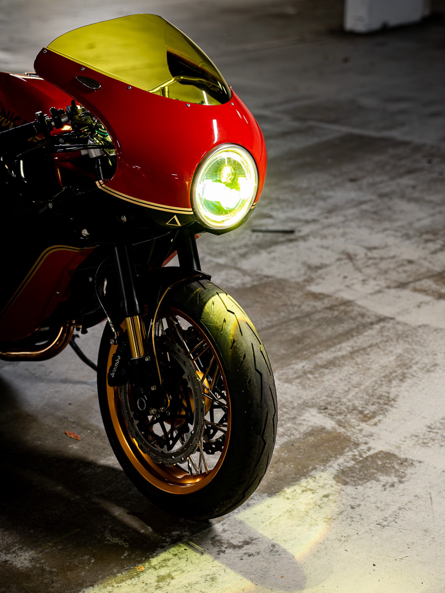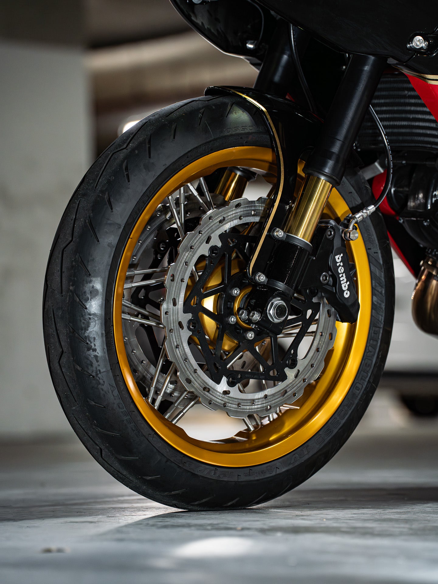 Next up, I measured the wheels and got in touch with our mates in Milan at Jonich Wheels. Fabio and his two sons sent over an exciting prototype design that would suit the build perfectly. The Jonich Exagon wheel design blends the nostalgic feel of a spoked wheel with a future-focused design direction. The Exagon style updates the conventional 3-cross spoke pattern to a set of larger 10mm spokes in five groups, with a distinct lacing pattern. Delivered in gold anodised with polished stainless steel spokes, one of the five spokes in each set was gold-coated. A red bike with gold wheels—can it get any more Ducati?