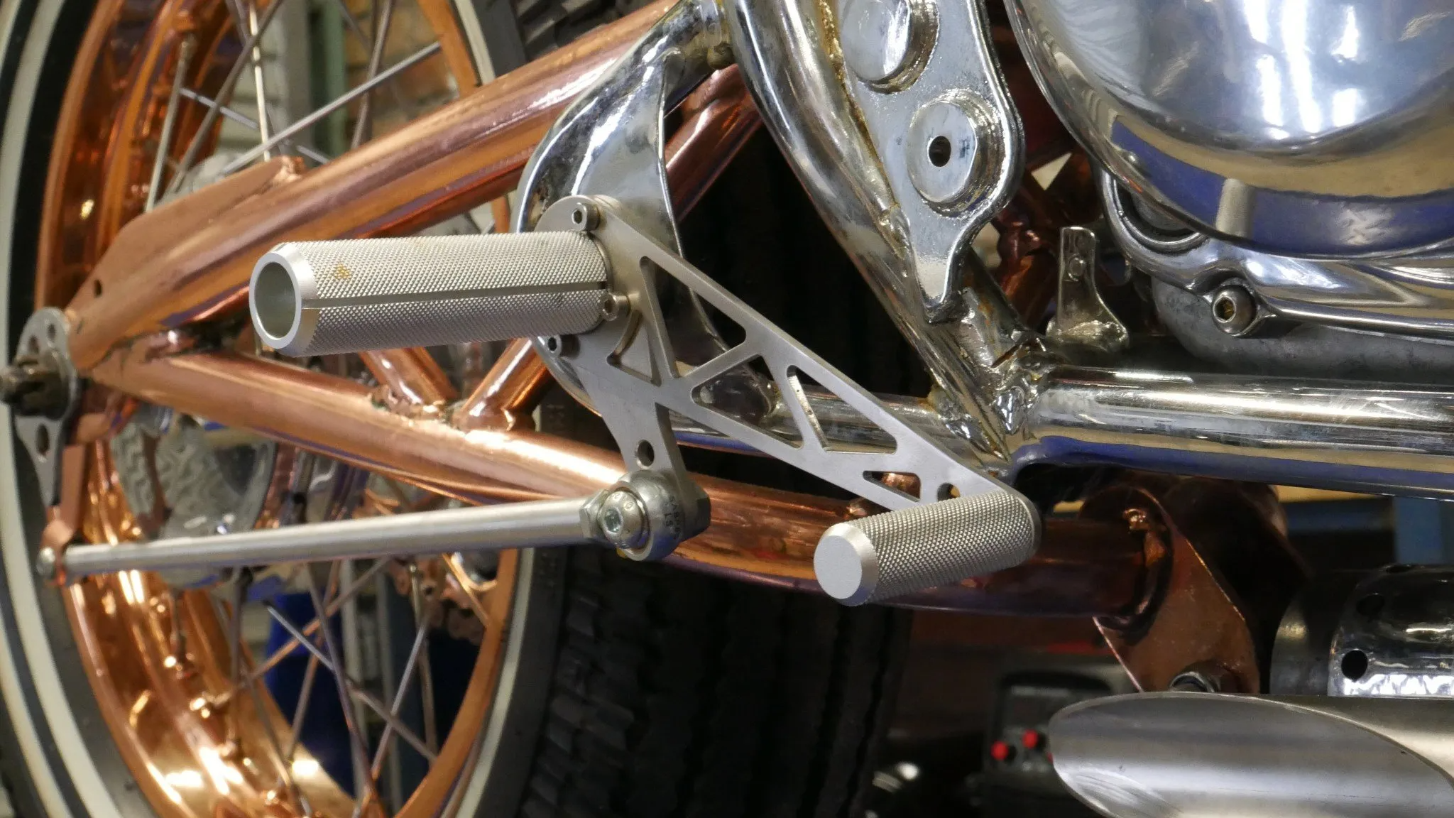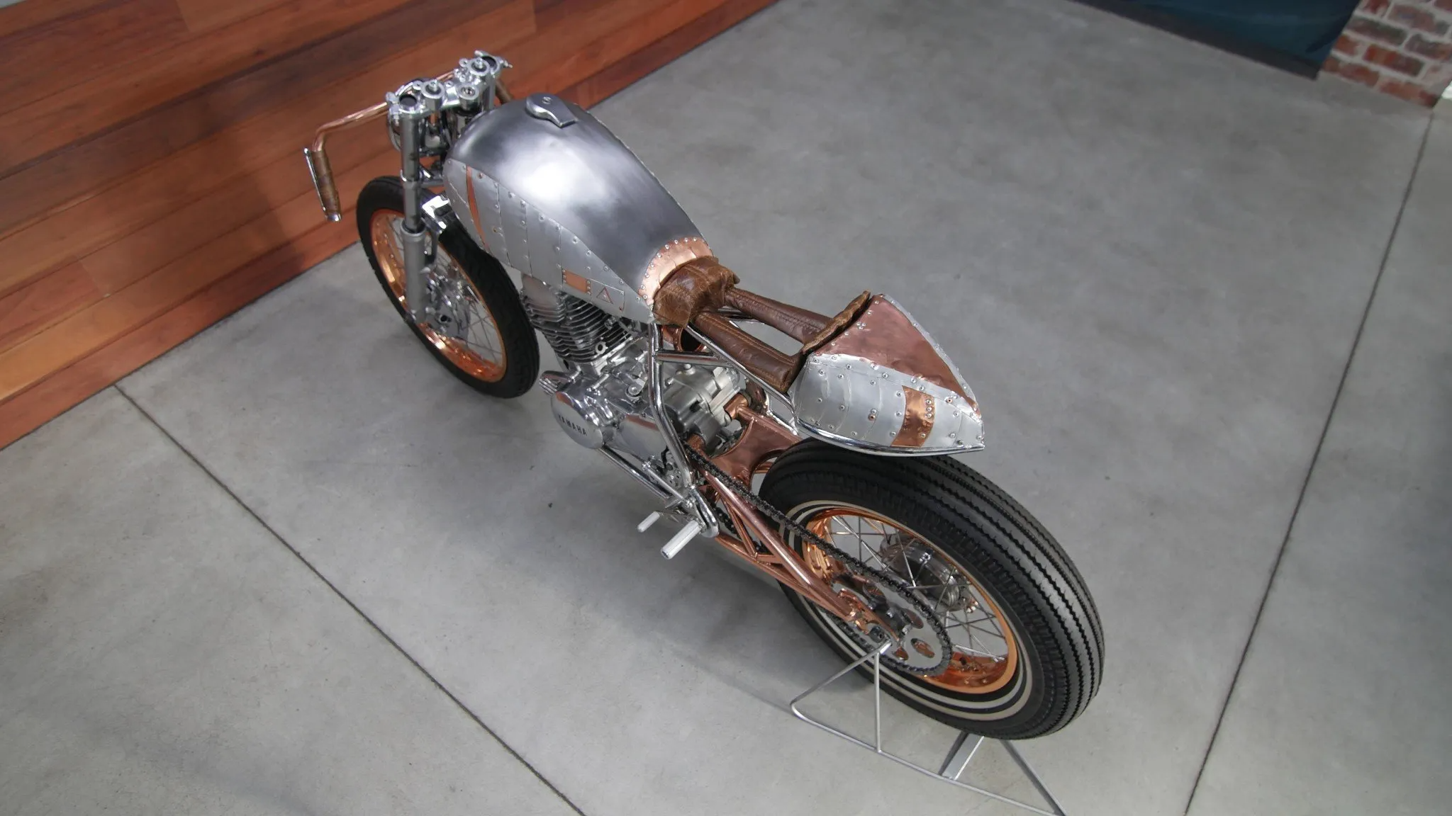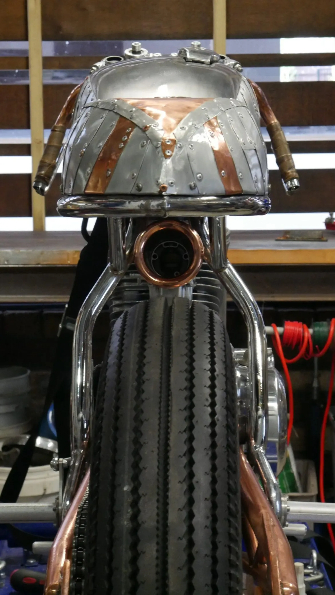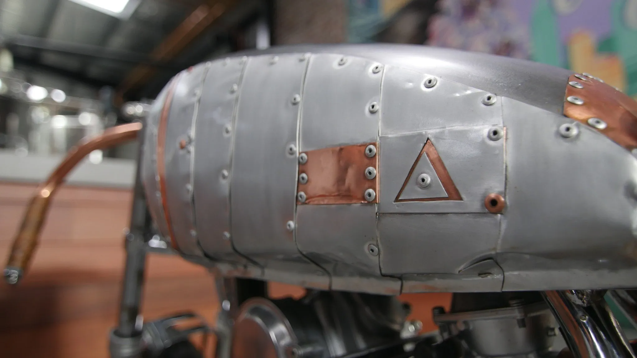 Ich machte mich daran, die Verkleidung im Flugzeugstil an Tank und Heck zu besorgen. Man hatte mir Materialien von Cocolea-Möbeln geschickt, die sie für die Herstellung ihrer einzigartigen Lounges und Sessel verwenden. Der Tank wurde zerlegt und oben mit Aluminium- und Kupferverkleidungen auf beiden Seiten gefeilt, die maßgeschneiderte Heckverkleidung aus Glasfaser erhielt die gleiche Behandlung. Der wahrscheinlich zeitaufwändigste Prozess waren die Nieten und die maßgefertigten Verkleidungen. Aufgrund der extrem geringen Stärke war es nahezu unmöglich, sie ohne Dellen oder Unvollkommenheiten zu handhaben (das merkt man am Finish). Ich beschloss, dagegen nicht anzukämpfen und versuchte, die Unvollkommenheiten auszunutzen, um ein etwas abgenutztes Aussehen zu erzeugen, und bürstete die Paneele nach dem Fixieren nach. Ich denke, es ist gut gelungen, da es einen Kontrast zwischen dem fein verchromten und polierten Rahmen und den Gehäusen ermöglicht.