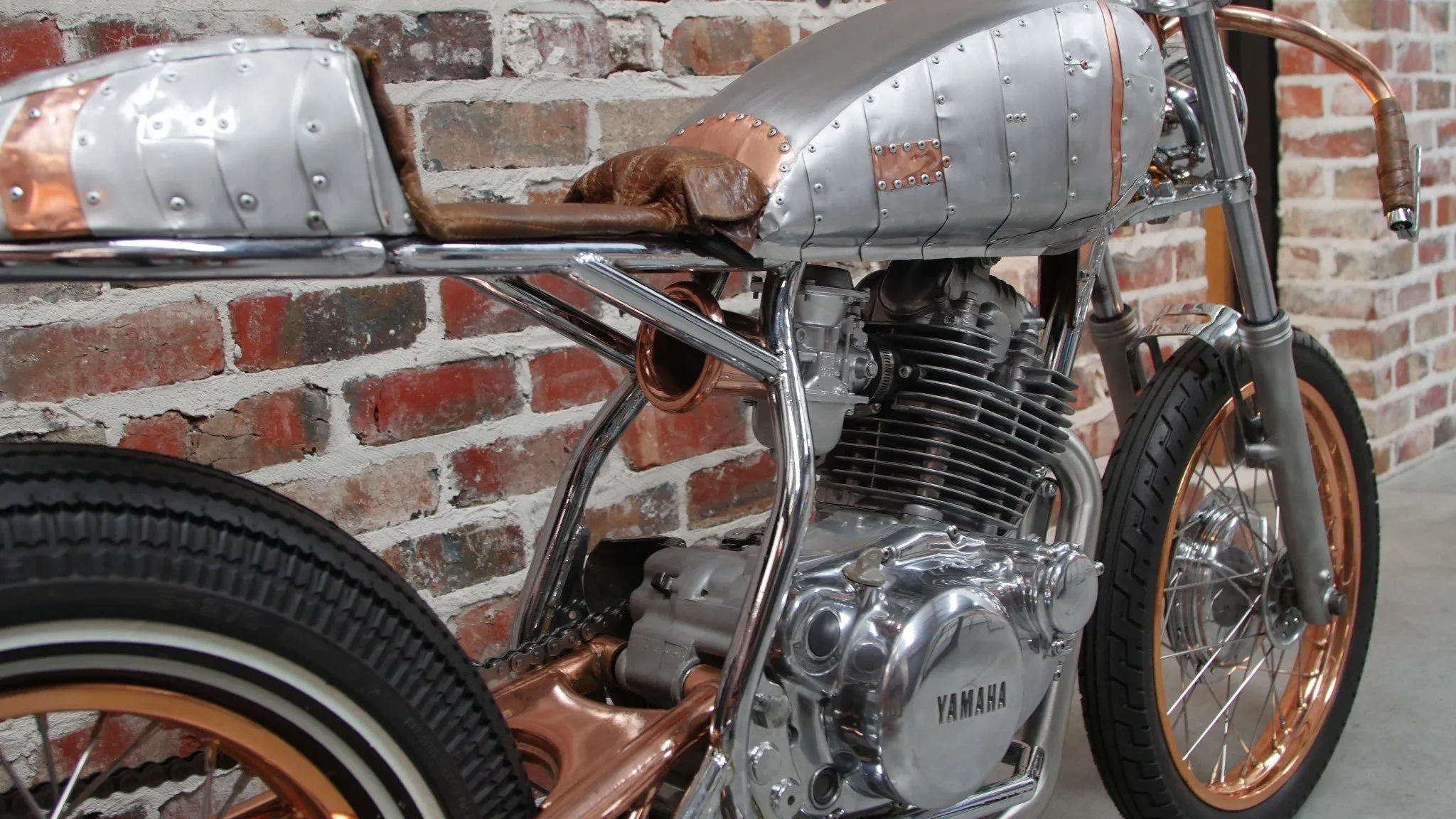Daraufhin kontaktierte ich einen Kumpel in Newcastle, der auf der Suche nach einem Fahrrad war. Ich wollte etwas Ikonisches und wirklich Bekanntes als Basis. Er hatte eine kaputte Yamaha SR250 von 1980, die einfach gut passen würde. Ich hatte bei der Sonderanfertigung freie Hand und wollte ein Fahrrad nehmen, das zuvor so oft modifiziert worden war, dass ich gezwungen war, tief zu graben und neue Ideen zu entwickeln. Als kleine Inspiration habe ich mich von einigen alten Kampfflugzeugen und ganz, ganz frühen Land-Speed-Bikes inspirieren lassen.