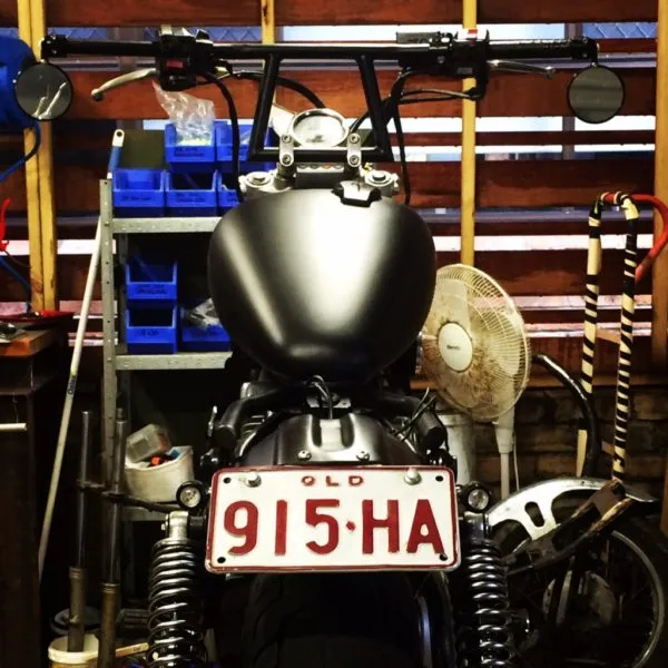 Die neuen Schutzvorrichtungen, der Hilfsrahmen, der Tank und der Sitz wurden alle im The Panel Shop in Mermaid Beach mit einer schönen seidenmatten schwarzen Lackierung versehen, während der maßgefertigte Brat-Sitz die Diamantstichbehandlung und die mit demselben Leder umwickelten Kunststoff-Seitenabdeckungen erhielt. Der Lenker im Bobber-Stil wurde mit neuer Ausrüstung ausgestattet und passend mit einigen Ledergriffen umwickelt.