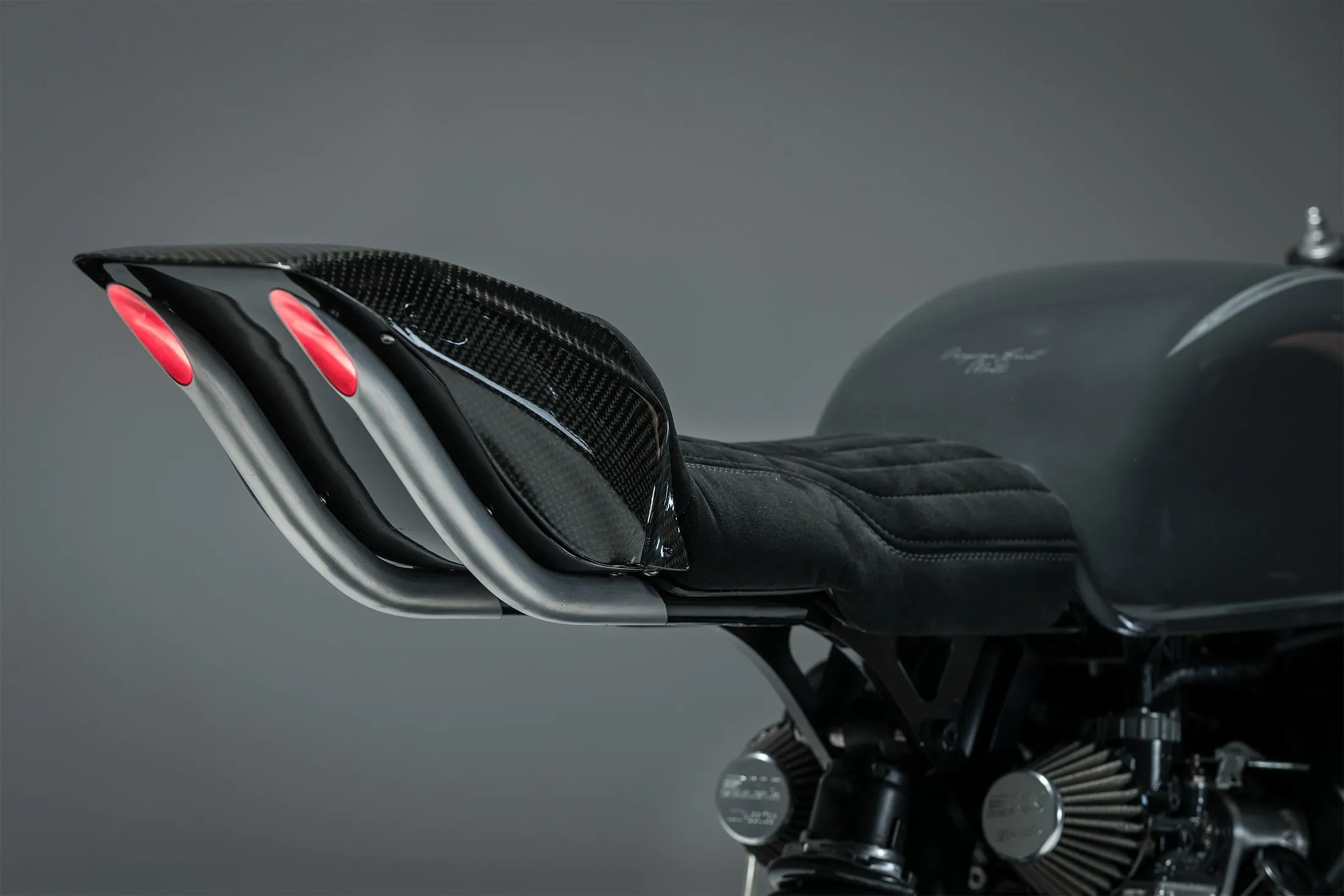 Avec les roues et les pneus en place et le niveau de suspension avant réglé, j'ai coupé le sous-châssis arrière de la colonne vertébrale et derrière les repose-pieds ; en le supprimant pour faire place à la conversion monoshock. Le CX500 ne me parle pas d'un vélo de style classique, je voulais repenser la façon dont la queue était fabriquée, j'ai donc décidé spécifiquement de ne pas encercler l'arrière. L'idée sur laquelle j'ai atterri était une conception à double tube en aluminium qui s'étendait de manière similaire à la conception de l'échappement. Il m'a fallu quelques essais avec ma cintreuse de tubes, mais le résultat s'est avéré exactement au moment où je voulais le fabriquer. Les tubes aux extrémités ouvertes abritent les feux arrière et soutiennent le capot arrière en fibre de carbone posé à la main qui flotte au-dessus.