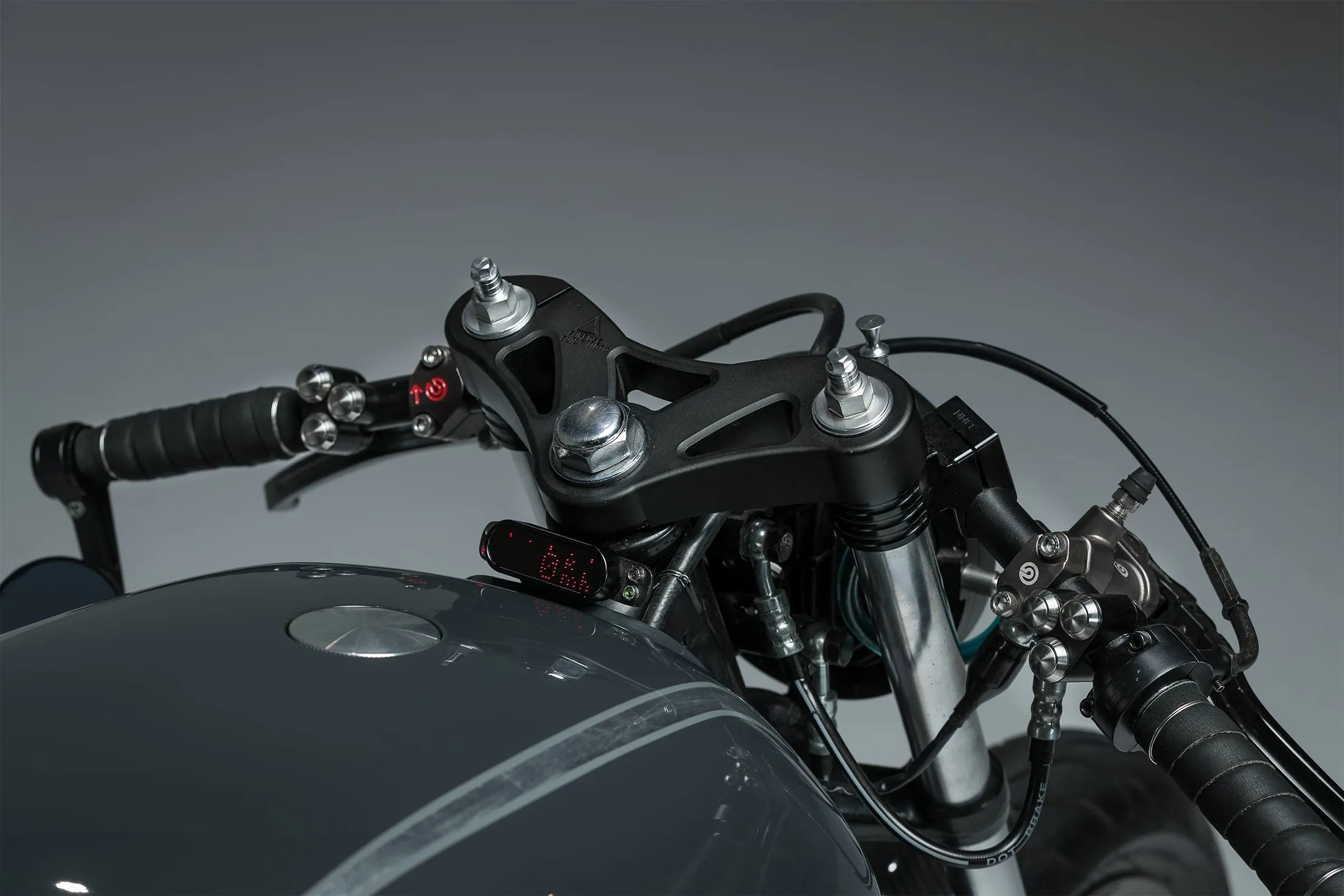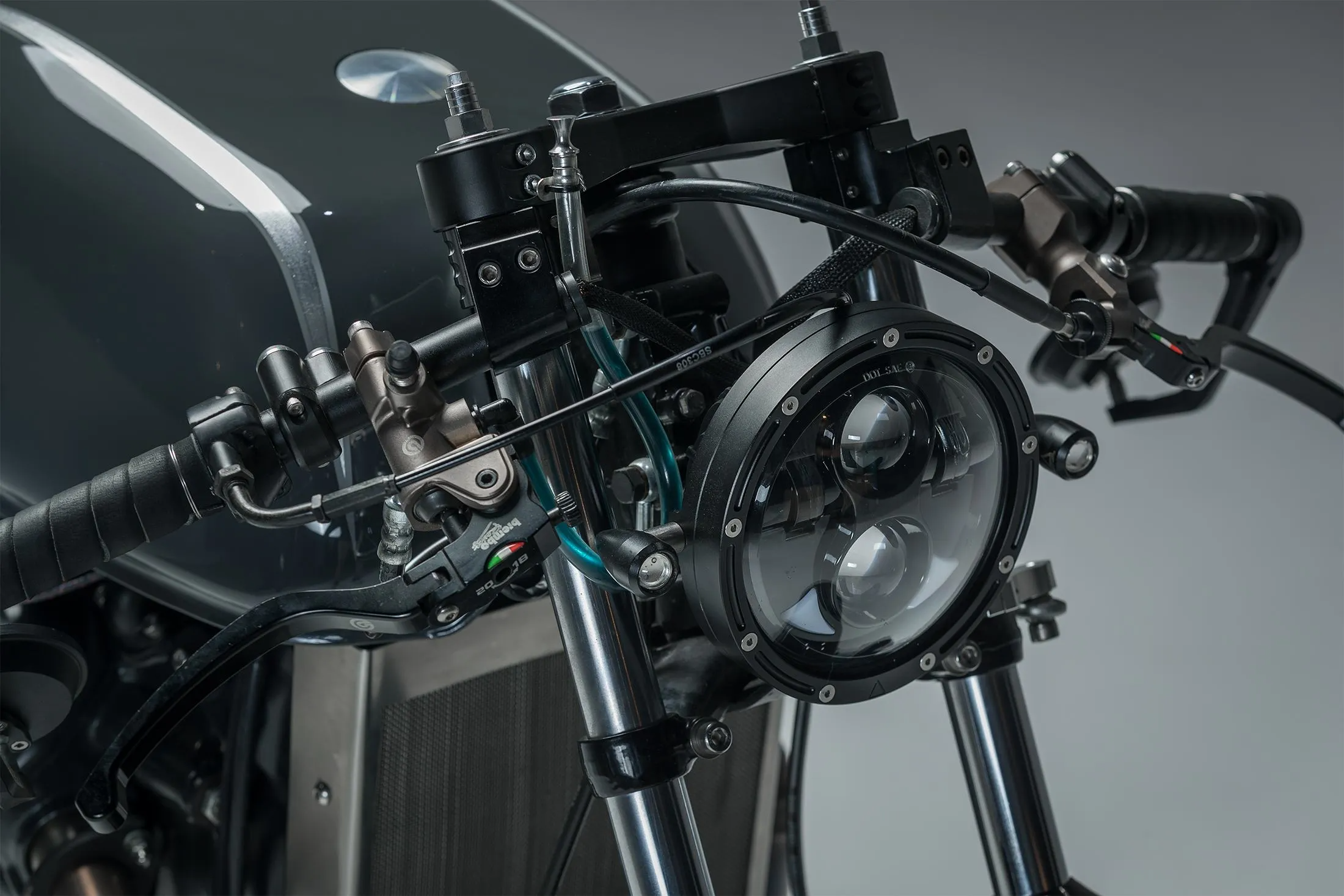 L'éclairage à l'avant est constitué d'un phare LED Flashpoint de 5,75 pouces et de quelques indicateurs à pointe creuse PBM. Le guidon à clipser est fini avec des commutateurs Moto spécialement conçus , des leviers de rechange et des poignées en cuir Nubuck noir enveloppées à la main.