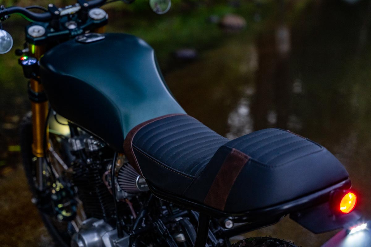 Ce vélo particulier repose sur de bons os. Au moment où la moto a été modélisée avec le nouveau moteur et les pièces de cadre et de châssis nouvellement enduites de poudre, il n'y avait plus grand-chose à peindre. Le GR650 Scrambler est un vélo Odd Ball qui rend le choix d'une couleur assez difficile. Après une conversation avec James, nous avons atterri sur un vert métallique profond, posé et satiné avec quelques détails noirs à peine perceptibles. Le vert est transporté depuis les supports de garde-boue, la triple pince et sur le réservoir. Tout le reste était noirci mat pour lui donner un petit avantage.
