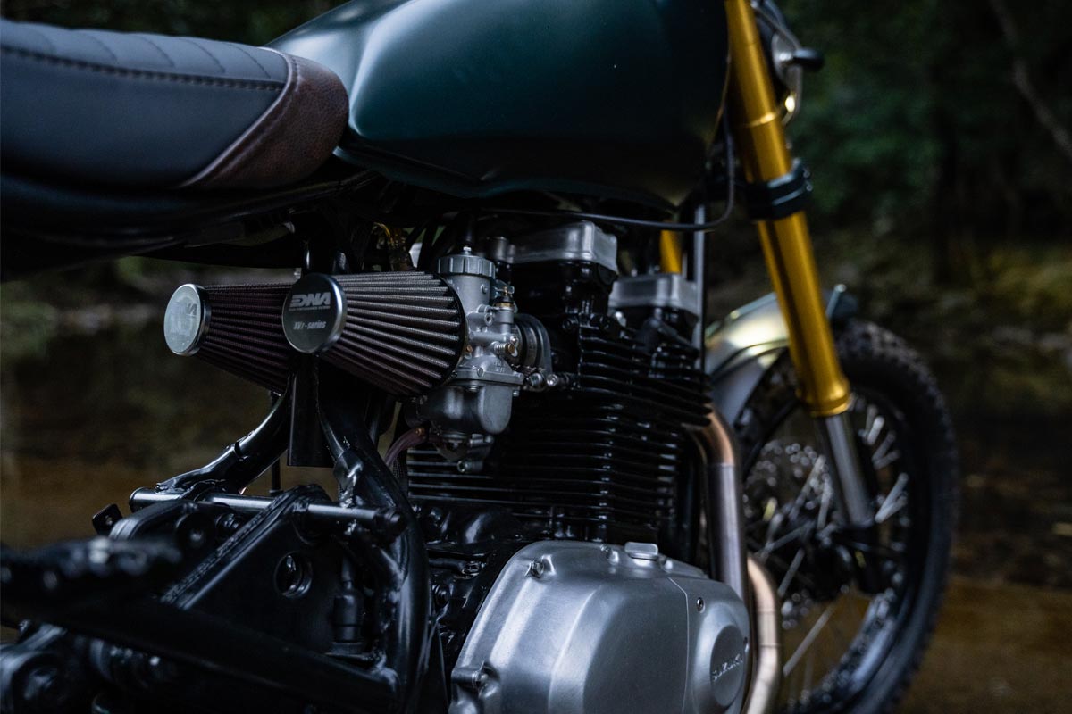 Le jumeau Suzuki 650 a reçu une reconstruction haut de gamme pendant que nous réparions quelques fuites d'huile embêtantes avant que l'ensemble du moteur ne soit nettoyé, peint et détaillé avec quelques boîtiers de finition brossée. Après une inspection des carburateurs du CV, j'ai pris la décision exécutive de jeter ces foutus trucs dans un gouffre sans fond. Remplacé rapidement par un ensemble de glissières Mikuni Round avec de nouvelles bottes d'admission. Respirant à travers un ensemble de filtres à dosettes ADN, le GR650 Scrambler a une tonne de balles de plus que jamais dans les années 80 !