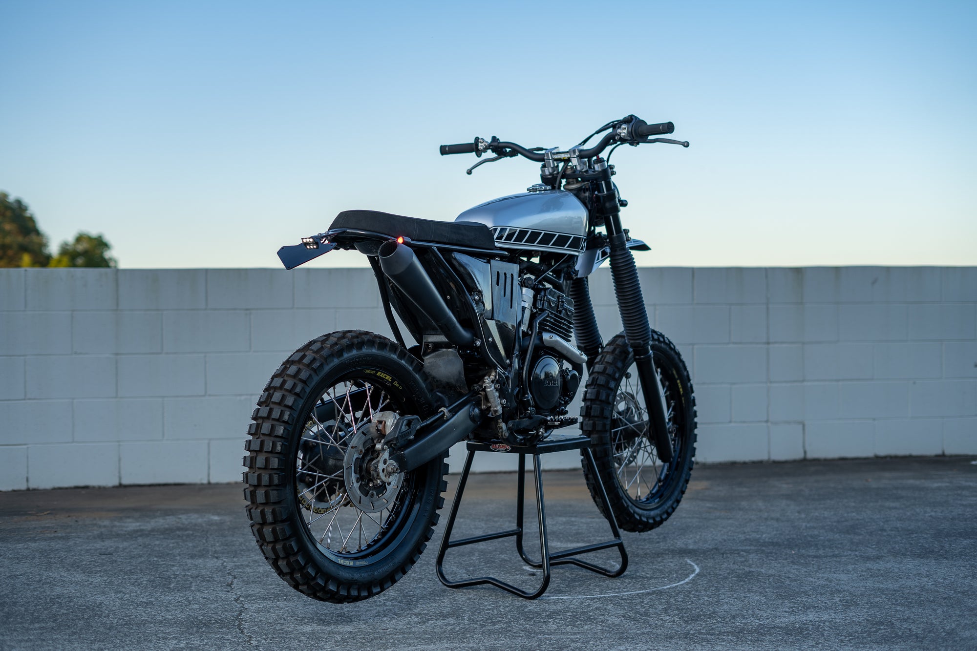 Le travail de fabrication s'est poursuivi sur l'avant avec tous les nouveaux éclairages installés sur des supports personnalisés et un garde-boue de style MX fabriqué à la main et conçu pour reposer haut au-dessus de la roue avant. Les roues d'origine ont été reconstruites avec des jantes Excel noires, de 18" à l'arrière et de 19" à l'avant enveloppées de pneus continentaux TKC80. Les barres ont été remplacées par une barre conique professionnelle à faible courbure, avec de nouveaux leviers et un maître-cylindre remplacé d'une Kawasaki Ninja 2018. 250. Les commutateurs PBM à 3 boutons fonctionnent vers un module Black Box sous le siège qui contrôle le phare éclair de 5,75 pouces et les clignotants 3-en-1 utilisés à l'avant et à l'arrière sur le brouilleur TTR250.