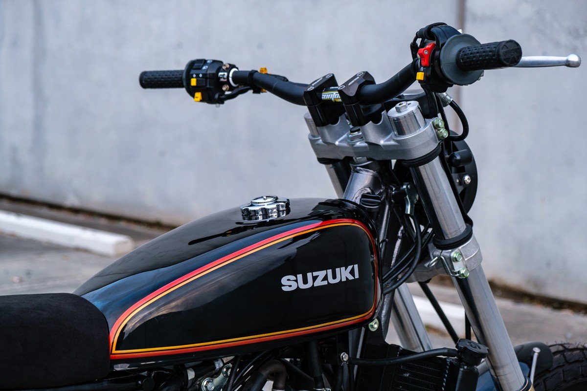 Le montage du réservoir était simple, quelques supports fabriqués sur mesure, reliés au cadre via des supports isolants en caoutchouc. Nous utilisons une méthode similaire à celle de notre série Signature Ducati pour nous assurer que les vibrations de ce gros single n'inquiéteront pas le nouveau réservoir en acier. Fini dans un noir brillant avec des rayures rouge/jaune fondu et un logo Suzuki argenté audacieux, le tout peint par Justin chez Popbang Classics.