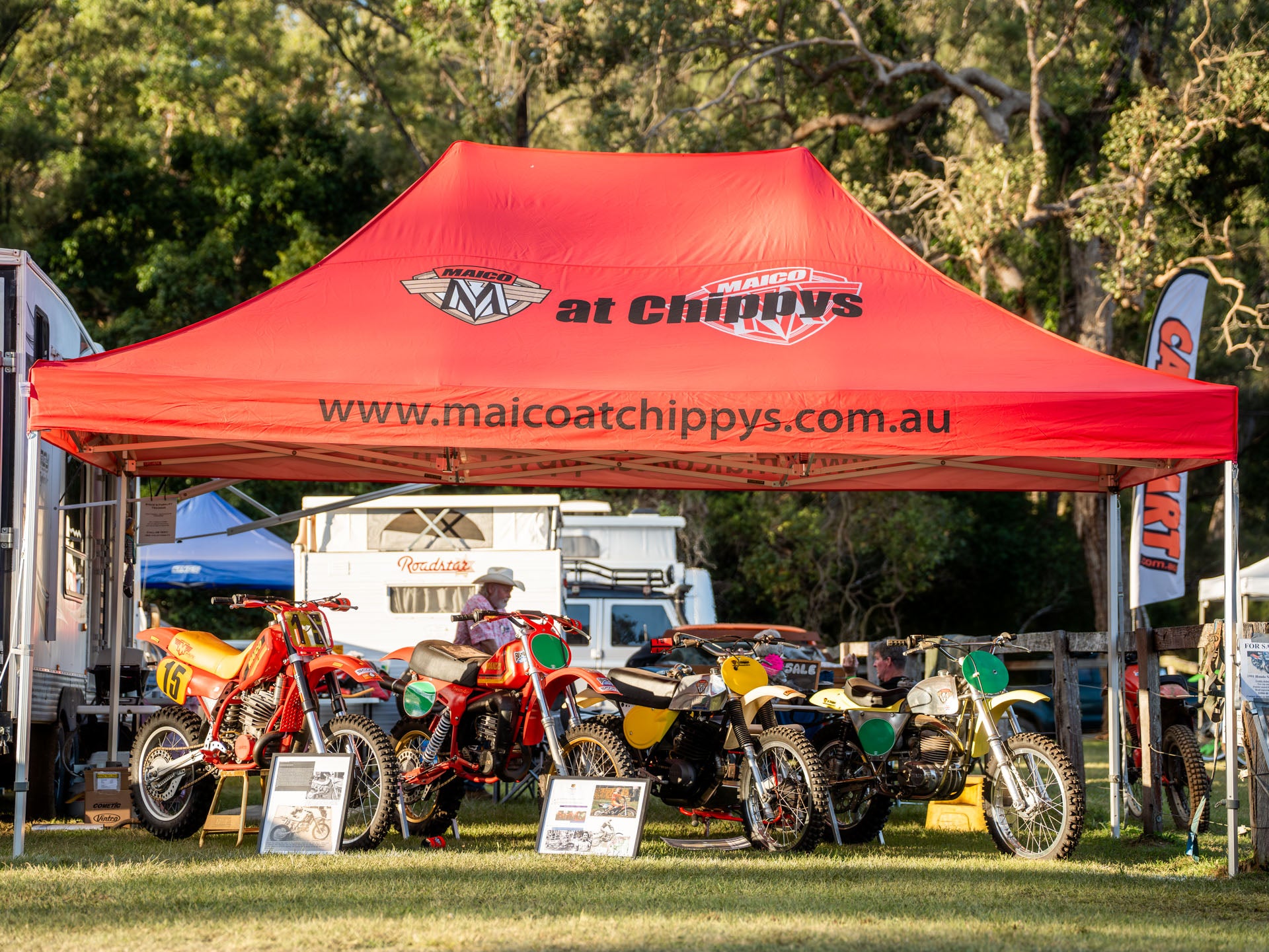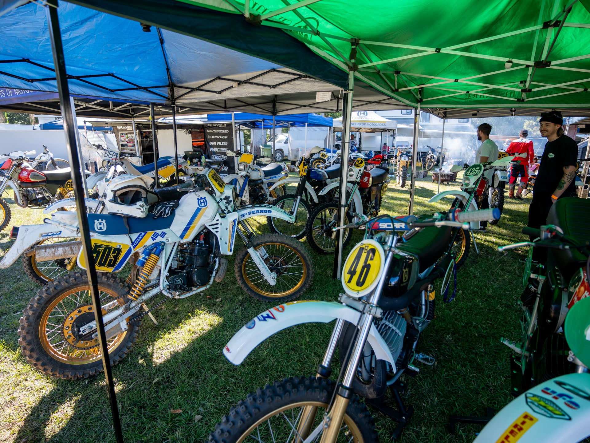 With large camps and tents dedicated to only one marque you can wander in and see every model of a particular era for that brand on display. We walked through entire collections of Bultaco, Husqvarna, Suzuki, Maico, Honda with the owners all happy to share details on their chosen collection. Usually the only bikes missing from the line up were the ones being hammered around the track at that point in time.