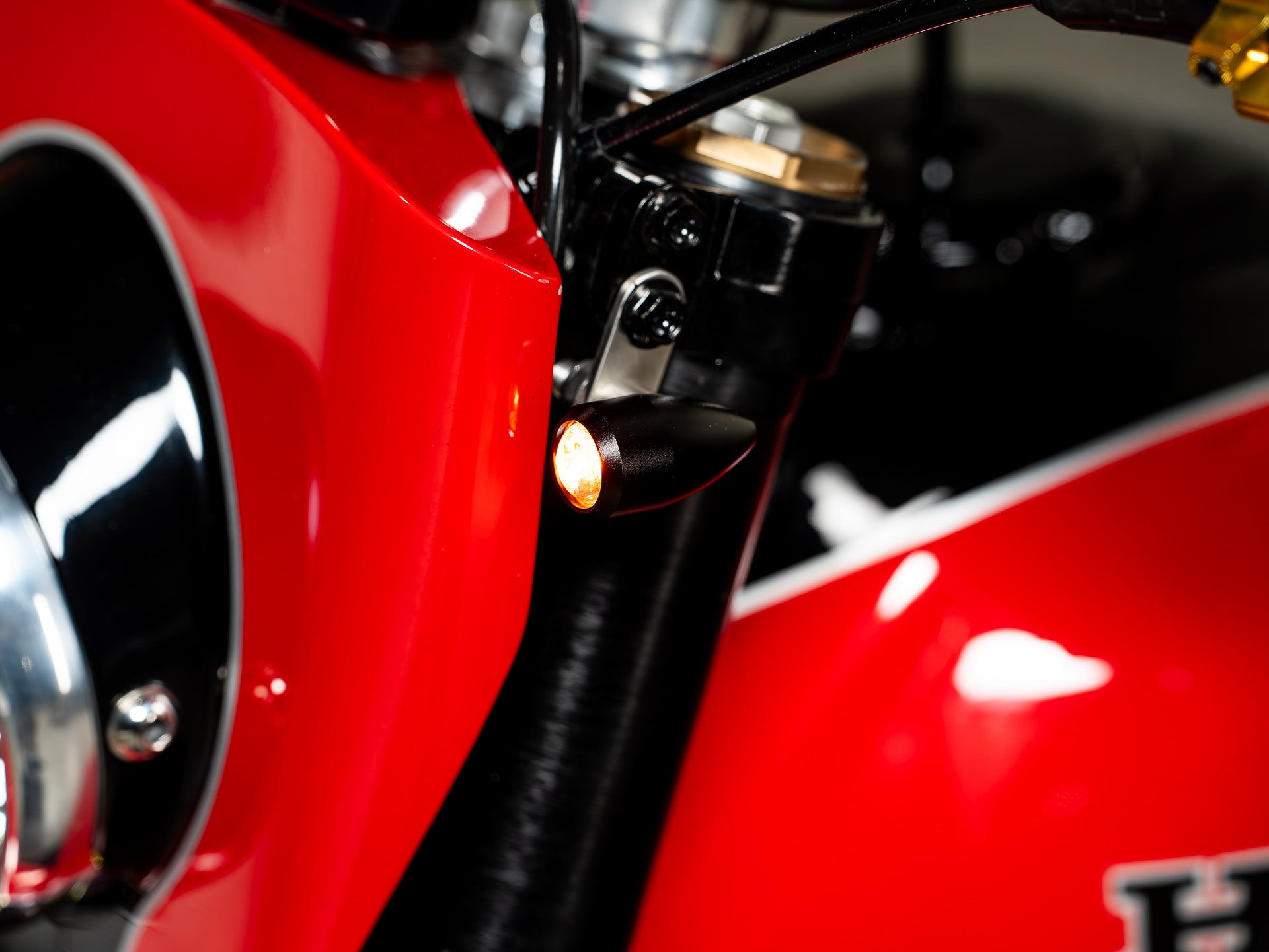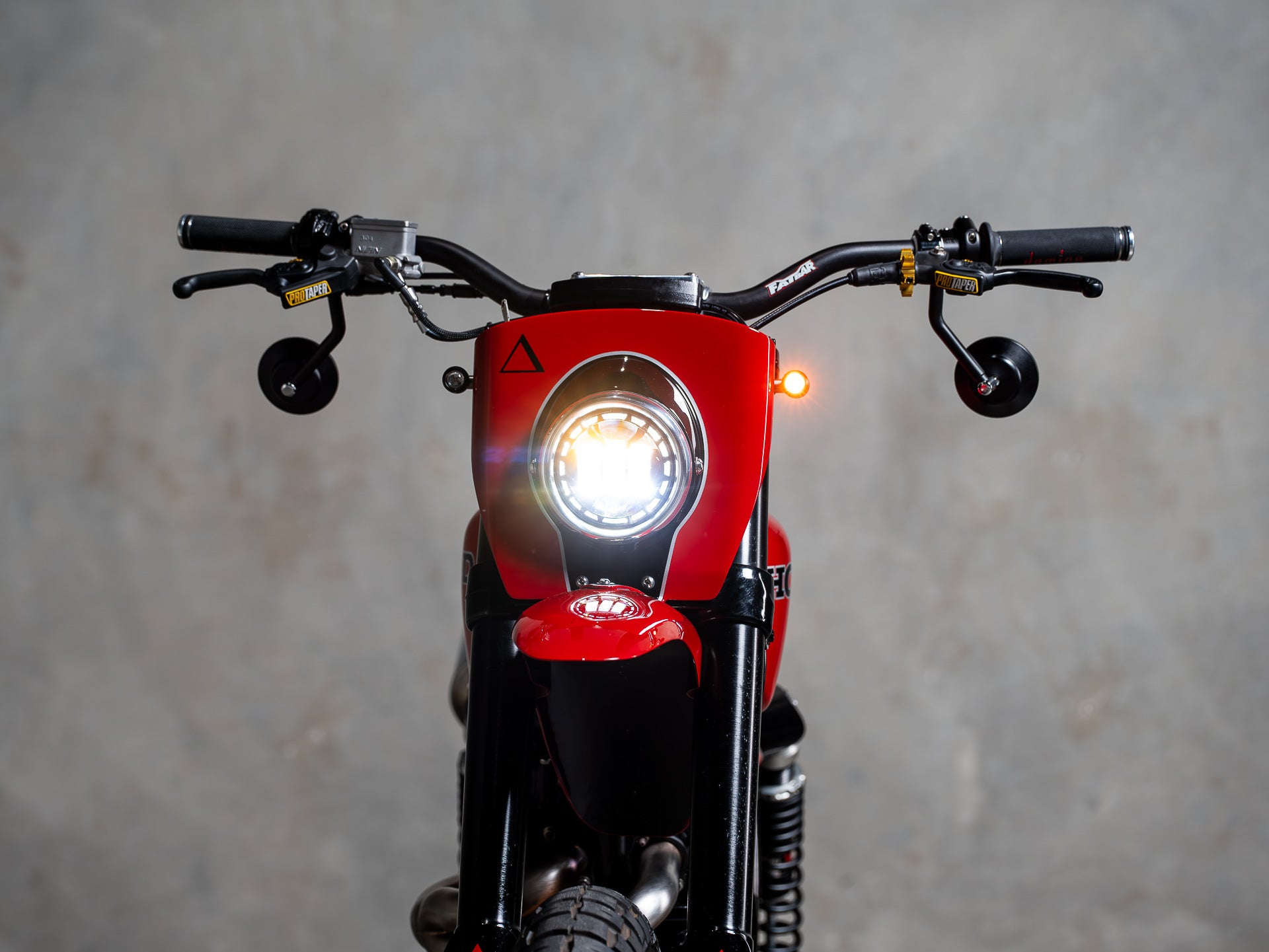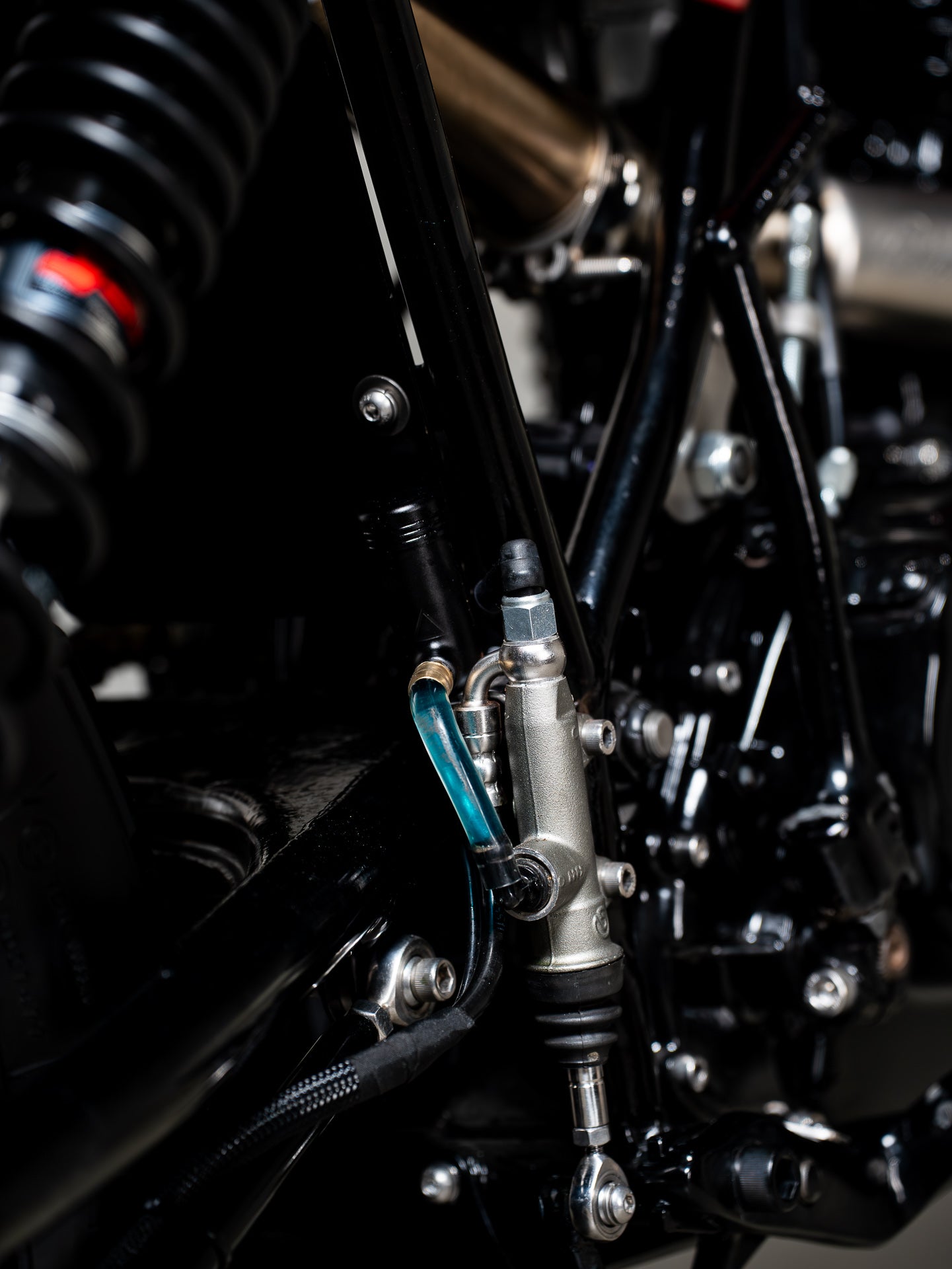 Up top, you’ll find Renthal fat bars, PBM three-button switches, under-bar mirrors, and a Daytona Deva digital dash—giving you all the info you need without disturbing that clean look. The ignition system is upgraded with our soon-to-be-released mini key and relay setup. Combined with Domino grips and rebuilt brake components, everything you touch feels top-notch and ready to roll.