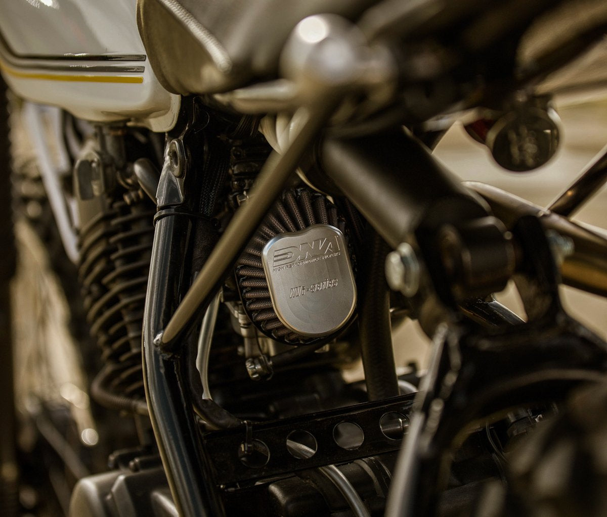 Complètement caché sous la selle, l’électricité de ce vélo est assez minime. Une conversion 12V était nécessaire, avec l'ajout d'une batterie antigravité. Pas de démarreur et les circuits d'éclairage ont été encore simplifiés grâce à l'utilisation du module de commande Purpose Built Moto Black Box . La boîte noire avec son contrôle d'éclairage, sa protection de circuit intégrée et maintenant un circuit coupe-circuit s'occupe de tout ce qui est électrique. Parcourez un ensemble de boutons-poussoirs sur le guidon pour une finition super propre.