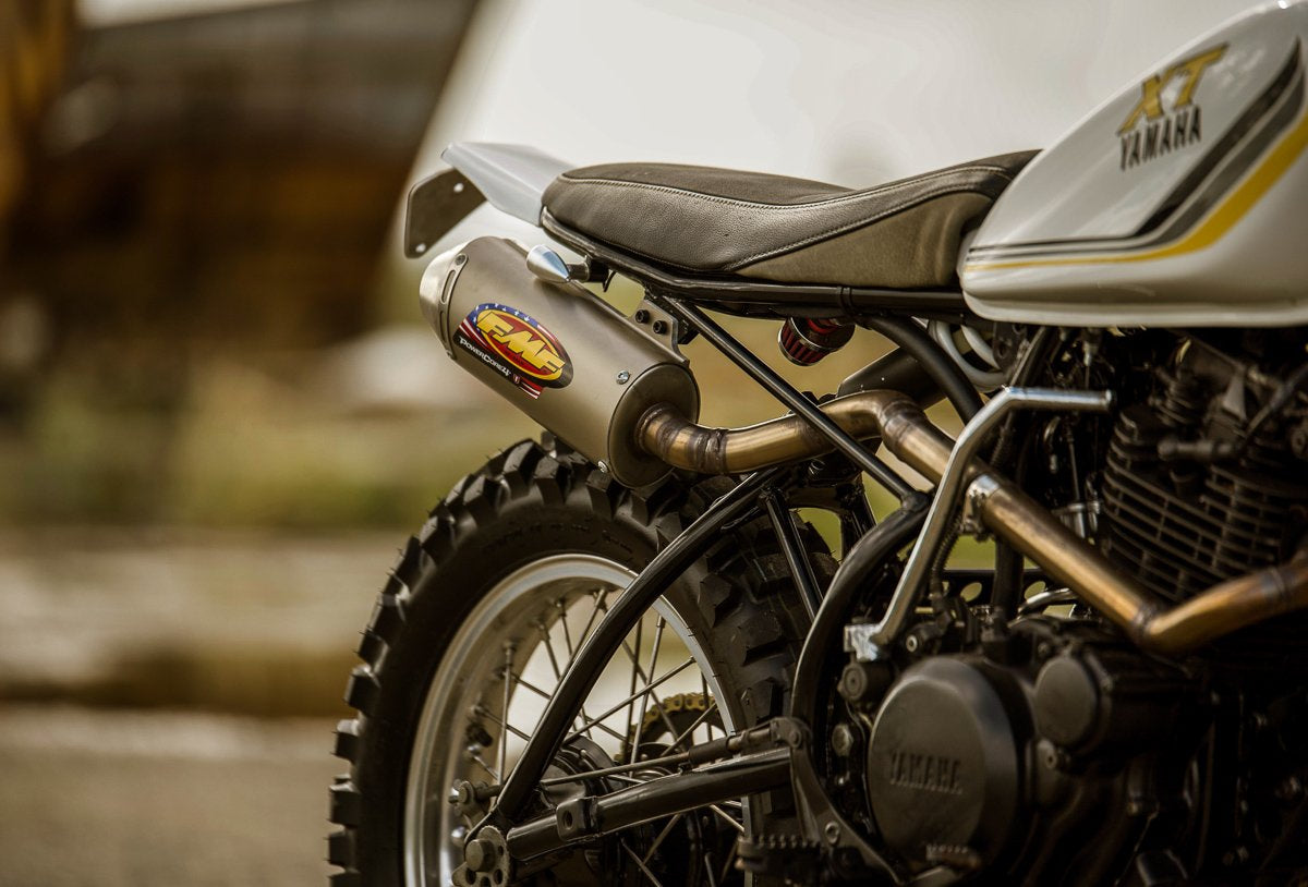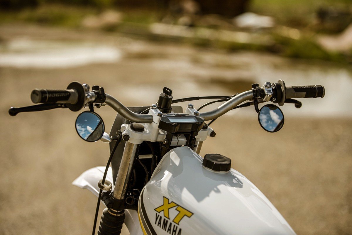 La seule chose qui a été conservée en usine sur le Yamaha Scrambler XT était le réservoir. L'un des derniers réservoirs en étain de ces motos, le combo blanc, jaune et gris était trop beau pour être changé. Un ensemble de décalcomanies d'usine de reproduction peintes et les nouvelles ailes/protections faites à la main peintes en conséquence. Le siège de bar de style Custom MX a été fini et recouvert par Jamason de Timeless Autotrim (nous partageons une boutique) avec quelques pièces d'accent grises et jaunes.